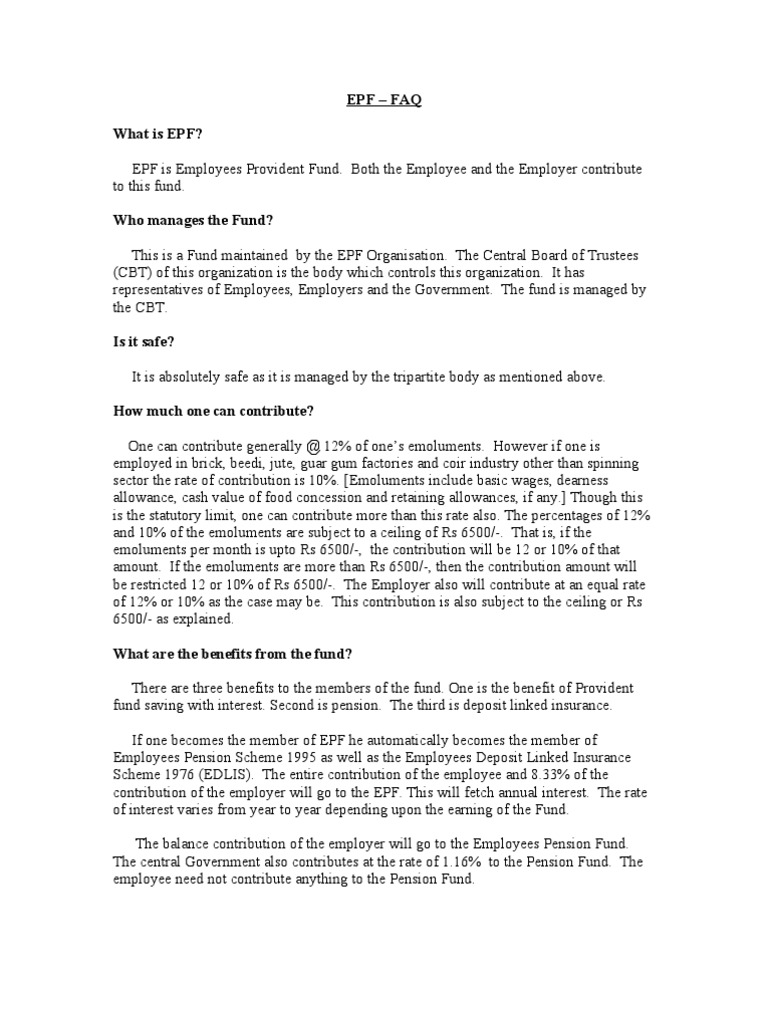 . Both the Employee and the Employer contribute to this fund. Who manages the Fund? This is a Fund maintained by the EPF Organisation. The Central Board of Trustees (CBT) of this organization is the body which controls this organization. It has representatives of Employees, Employers and the Government. The fund is managed by the CBT. Is it safe? It is absolutely safe as it is managed by the tripartite body as mentioned above. How much one can contribute? One can contribute generally @ 12% of ones emoluments. However if one is employed in brick, beedi, jute, guar gum factories and coir industry other than spinning sector the rate of contribution is 10%. [Emoluments include basic wages, dearness allowance, cash value of food concession and retaining allowances, if any.] Though this is the statutory limit, one can contribute more than this rate also. The percentages of 12% and 10% of the emoluments are subject to a ceiling of Rs 6500/-. That is, if the emoluments per month is upto Rs 6500/-, the contribution will be 12 or 10% of that amount. If the emoluments are more than Rs 6500/-, then the contribution amount will be restricted 12 or 10% of Rs 6500/-. The Employer also will contribute at an equal rate of 12% or 10% as the case may be. This contribution is also subject to the ceiling or Rs 6500/- as explained. What are the benefits from the fund? There are three benefits to the members of the fund. One is the benefit of Provident fund saving with interest. Second is pension. The third is deposit linked insurance. If one becomes the member of EPF he automatically becomes the member of Employees Pension Scheme 1995 as well as the Employees Deposit Linked Insurance Scheme 1976 (EDLIS). The entire contribution of the employee and 8.33% of the contribution of the employer will go to the EPF. This will fetch annual interest. The rate of interest varies from year to year depending upon the earning of the Fund. The balance contribution of the employer will go to the Employees Pension Fund. The central Government also contributes at the rate of 1.16% to the Pension Fund. The employee need not contribute anything to the Pension Fund.