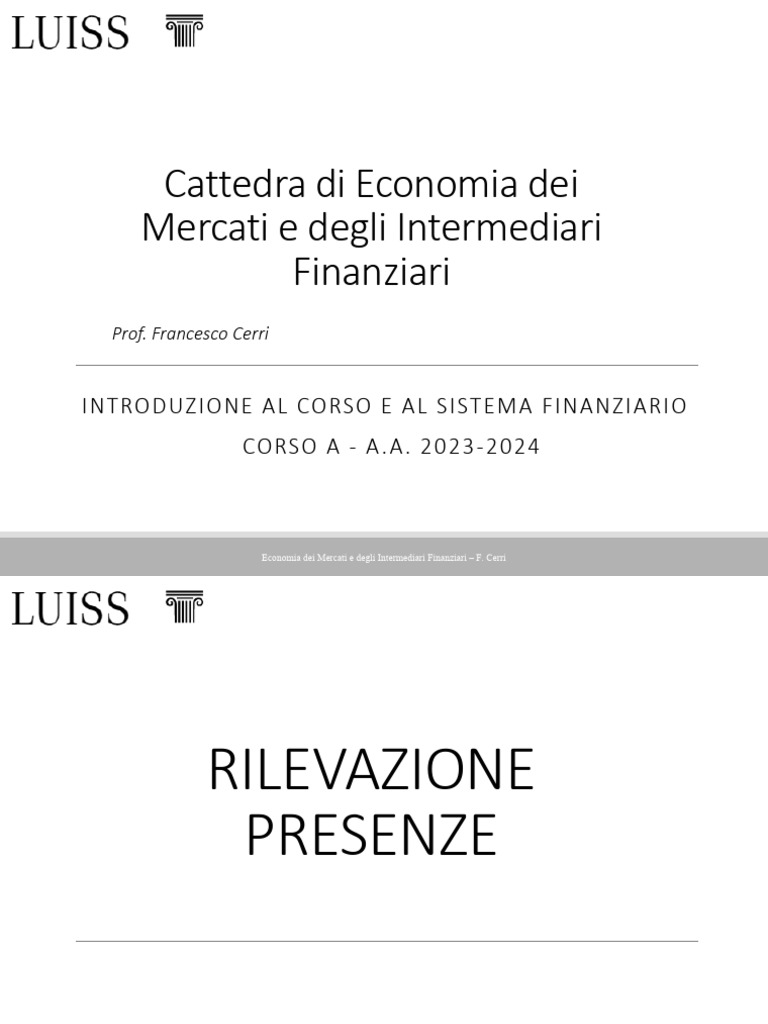 mercoledì 7 febbraio 2024 16:45 - 17:30 1 Introduzione al corso e al Sistema Finanziario 2 Cerri Aula lezioni 1 (online) [Sede virtuale lezioni a distanza]