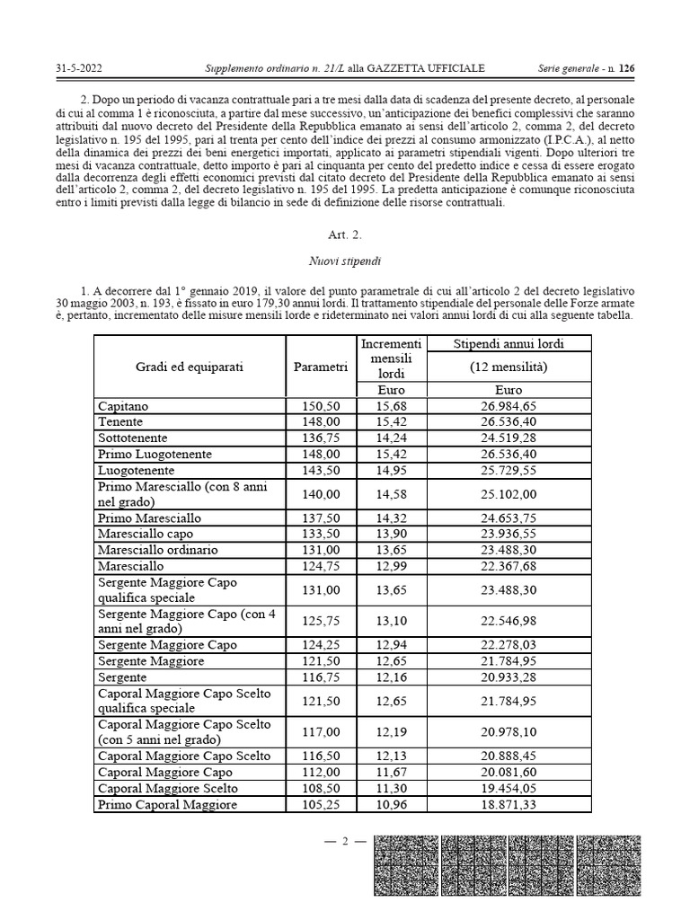 30 maggio 2003, n. 193, è fissato in euro 179,50 annui lordi. Il trattamento stipendiale del personale delle Forze armate