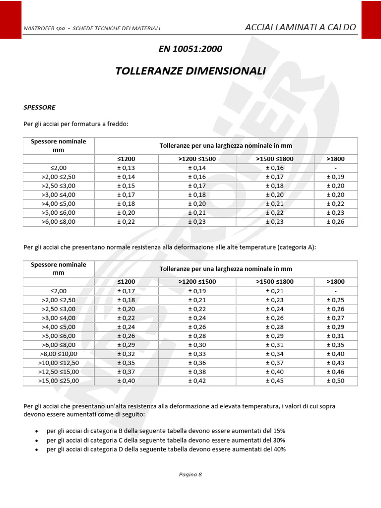 Le tolleranze sulla larghezza dei coils interi non cesoiati in nastri e delle lamiere sono riportate nel prospetto