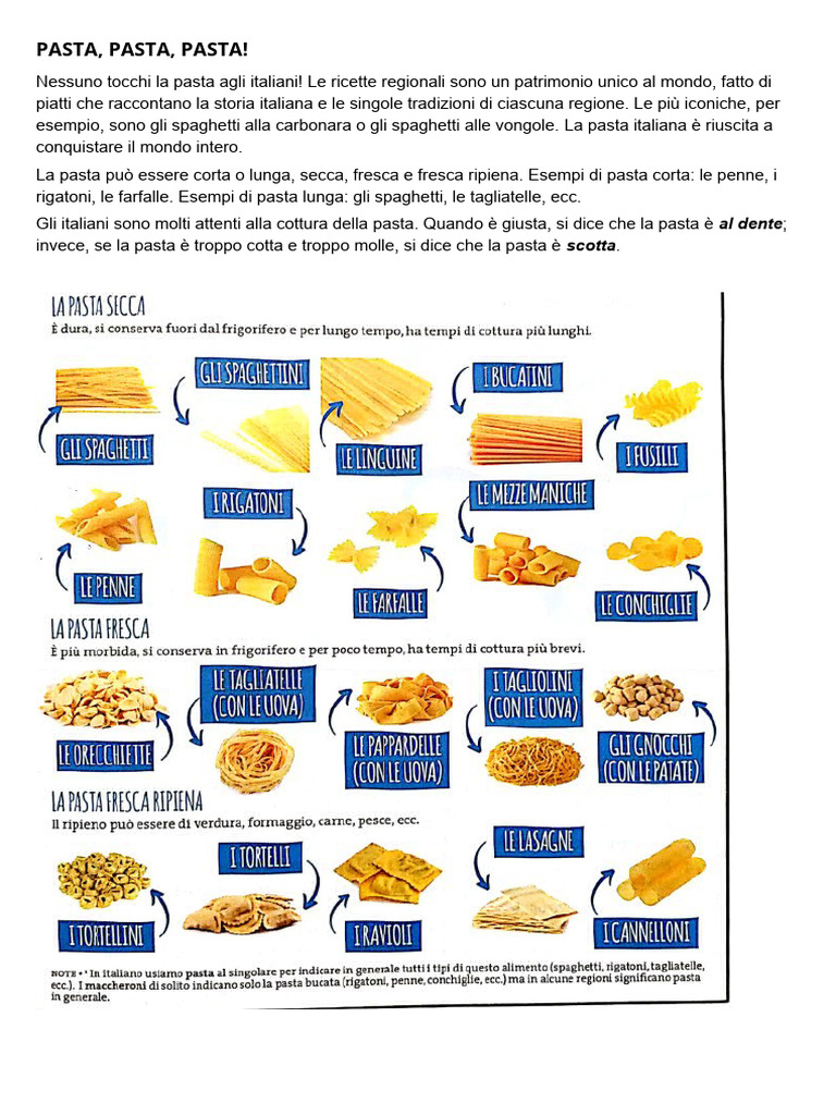 rigatoni, le farfalle. Esempi di pasta lunga: gli spaghetti, le tagliatelle, ecc.