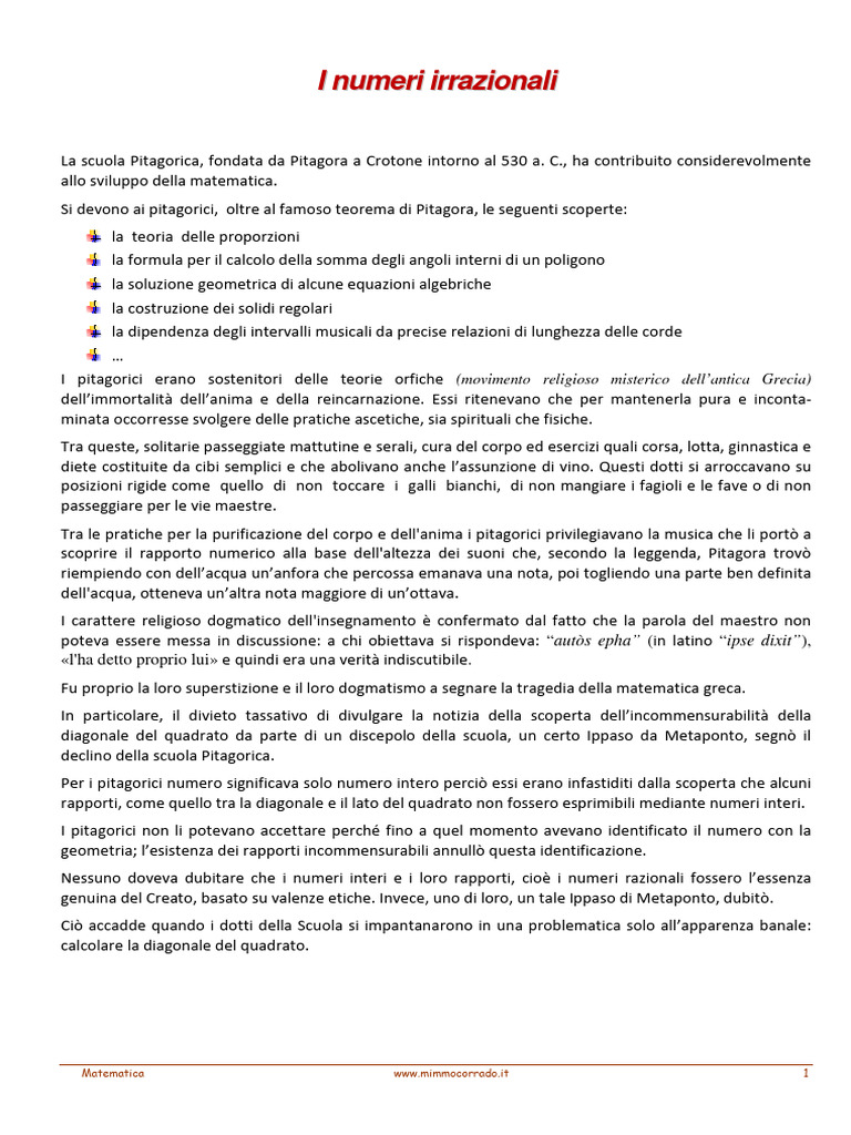 rapporti, come quello tra la diagonale e il lato del quadrato non fossero esprimibili mediante numeri interi.