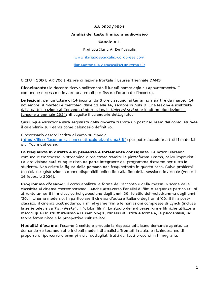 Programma d’esame: Il corso analizza le forme del racconto e della messa in scena dalla