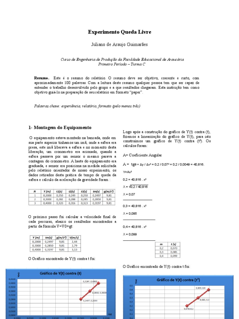devem preparar seus relatrios seguindo este padro apresentado, que j vem pr-formatado, com base no modelo do Journal of Applied Physics. Estes relatrios devero ser entregues em sala de aula, ou em local combinado com o professor, dentro do prazo preestabelecido. O relatrio deve conter no mximo quatro pginas e ser impresso com tinta preta em papel branco. A impresso deve ser feita em apenas um lado da pgina de tamanho A4 empregando o formato aqui mostrado. Todos os relatrios devem estar em lngua portuguesa. A fonte principal utilizada no texto deve ser Times New Roman, tamanho 10 pontos. O espaamento entre linhas deve ser simples. O primeiro pargrafo de cada seo ou subseo no deve estar indentado. Os demais pargrafos devem estar indentados em 0,5 cm. Com relao formatao das pginas: 1. 2. 3. 4. Ttulo: fonte Times New Roman, tamanho 14 pontos em negrito. Espaamento simples entre as linhas; Nome dos Autores: Times New Roman, tamanho 12 pontos, centralizado. Espaamento simples entre as linhas; Curso e Instituio: Times New Roman, tamanho 10 pontos, itlico, centralizado. Espaamento simples entre as linhas; Turma e Perodo: Times New Roman, tamanho 10 pontos, itlico, centralizado na linha seguinte Curso e Instituio. Espaamento simples entre as linhas; Resumo: Times New Roman, tamanho 10 pontos, com recuo de 1 cm esquerda e direita. A palavra Resumo deve ser escrita em negrito. Espaamento simples entre as linhas; Palavras Chave: Times New Roman, tamanho 10 pontos, itlico, com recuo de 1 cm esquerda e direita. Este item no vai consumir mais do que uma linha; Ttulo de Seo: Times New Roman, tamanho 12 pontos em negrito. Ttulo de Subseo: Times New Roman, tamanho 10 pontos em negrito.