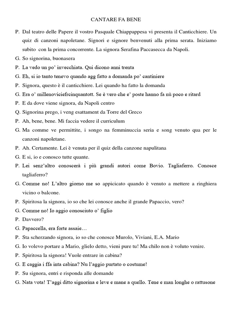 P. Su signora, si concentri. Io le dirò la prima strofa di una canzone napoletana, e quando