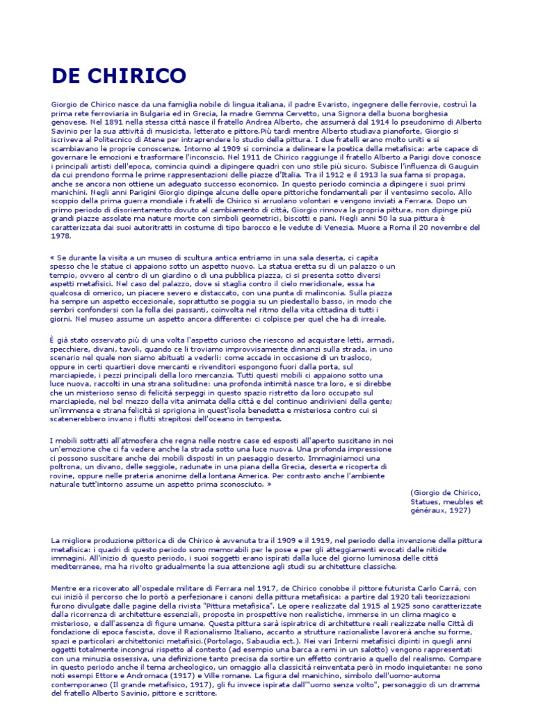 Giorgio de Chirico nasce da una famiglia nobile di lingua italiana, il padre Evaristo, ingegnere delle ferrovie, costru la prima rete ferroviaria in Bulgaria ed in Grecia, la madre Gemma Cervetto, una Signora della buona borghesia genovese. Nel 1891 nella stessa citt nasce il fratello Andrea Alberto, che assumer dal 1914 lo pseudonimo di Alberto Savinio per la sua attivit di musicista, letterato e [Link] tardi mentre Alberto studiava pianoforte, Giorgio si iscriveva al Politecnico di Atene per intraprendere lo studio della pittura. I due fratelli erano molto uniti e si scambiavano le proprie conoscenze. Intorno al 1909 si comincia a delineare la poetica della metafisica: arte capace di governare le emozioni e trasformare l'inconscio. Nel 1911 de Chirico raggiunge il fratello Alberto a Parigi dove conosce i principali artisti dell'epoca, comincia quindi a dipingere quadri con uno stile pi sicuro. Subisce linfluenza di Gauguin da cui prendono forma le prime rappresentazioni delle piazze dItalia. Tra il 1912 e il 1913 la sua fama si propaga, anche se ancora non ottiene un adeguato successo economico. In questo periodo comincia a dipingere i suoi primi manichini. Negli anni Parigini Giorgio dipinge alcune delle opere pittoriche fondamentali per il ventesimo secolo. Allo scoppio della prima guerra mondiale i fratelli de Chirico si arruolano volontari e vengono inviati a Ferrara. Dopo un primo periodo di disorientamento dovuto al cambiamento di citt, Giorgio rinnova la propria pittura, non dipinge pi grandi piazze assolate ma nature morte con simboli geometrici, biscotti e pani. Negli anni 50 la sua pittura caratterizzata dai suoi autoritratti in costume di tipo barocco e le vedute di Venezia. Muore a Roma il 20 novembre del 1978. Se durante la visita a un museo di scultura antica entriamo in una sala deserta, ci capita spesso che le statue ci appaiono sotto un aspetto nuovo. La statua eretta su di un palazzo o un tempio, ovvero al centro di un giardino o di una pubblica piazza, ci si presenta sotto diversi aspetti metafisici. Nel caso del palazzo, dove si staglia contro il cielo meridionale, essa ha qualcosa di omerico, un piacere severo e distaccato, con una punta di malinconia. Sulla piazza ha sempre un aspetto eccezionale, soprattutto se poggia su un piedestallo basso, in modo che sembri confondersi con la folla dei passanti, coinvolta nel ritmo della vita cittadina di tutti i giorni. Nel museo assume un aspetto ancora differente: ci colpisce per quel che ha di irreale. gi stato osservato pi di una volta l'aspetto curioso che riescono ad acquistare letti, armadi, specchiere, divani, tavoli, quando ce li troviamo improvvisamente dinnanzi sulla strada, in uno scenario nel quale non siamo abituati a vederli: come accade in occasione di un trasloco, oppure in certi quartieri dove mercanti e rivenditori espongono fuori dalla porta, sul marciapiede, i pezzi principali della loro mercanzia. Tutti questi mobili ci appaiono sotto una luce nuova, raccolti in una strana solitudine: una profonda intimit nasce tra loro, e si direbbe che un misterioso senso di felicit serpeggi in questo spazio ristretto da loro occupato sul marciapiede, nel bel mezzo della vita animata della citt e del continuo andirivieni della gente; un'immensa e strana felicit si sprigiona in quest'isola benedetta e misteriosa contro cui si scatenerebbero invano i flutti strepitosi dell'oceano in tempesta. I mobili sottratti all'atmosfera che regna nelle nostre case ed esposti all'aperto suscitano in noi un'emozione che ci fa vedere anche la strada sotto una luce nuova. Una profonda impressione ci possono suscitare anche dei mobili disposti in un paesaggio deserto. Immaginiamoci una poltrona, un divano, delle seggiole, radunate in una piana della Grecia, deserta e ricoperta di rovine, oppure nelle prateria anonime della lontana America. Per contrasto anche l'ambiente naturale tutt'intorno assume un aspetto prima sconosciuto. (Giorgio de Chirico, Statues, meubles et gnraux, 1927)