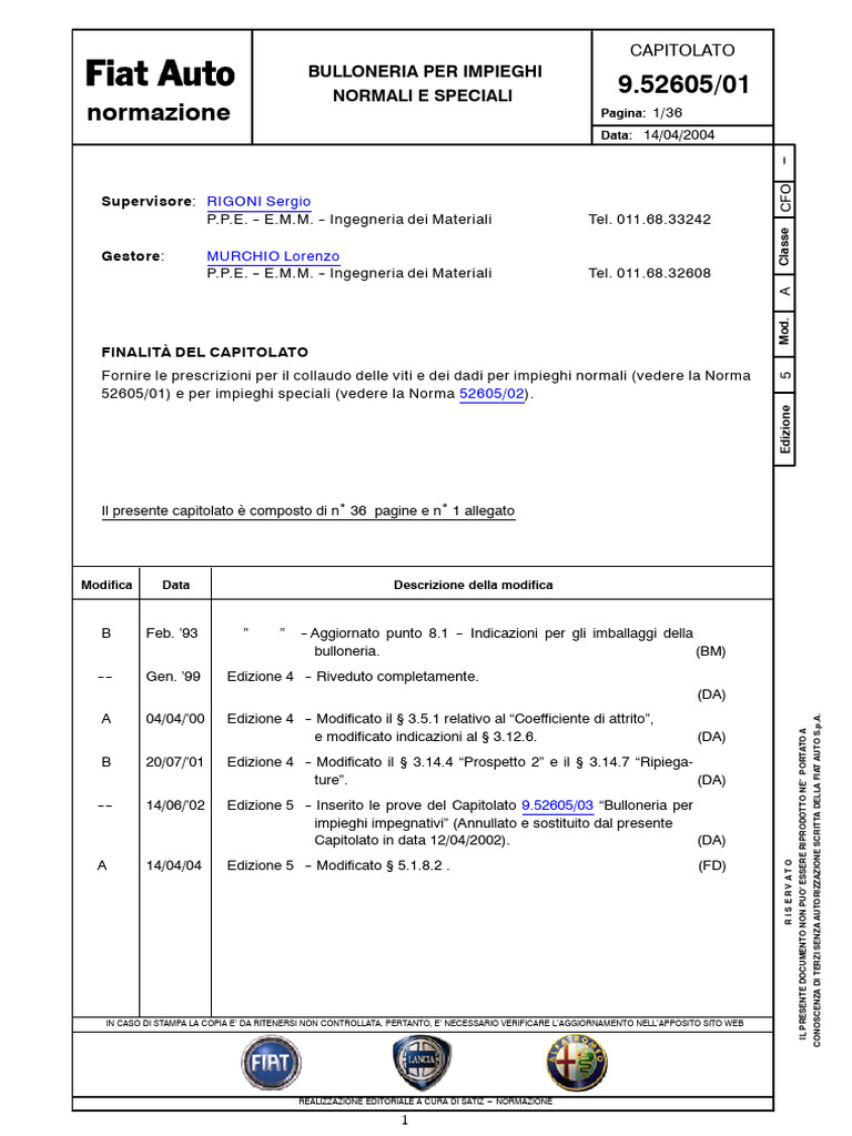 Normazione 9.52605/01: Bulloneria Per Impieghi Normali E Speciali