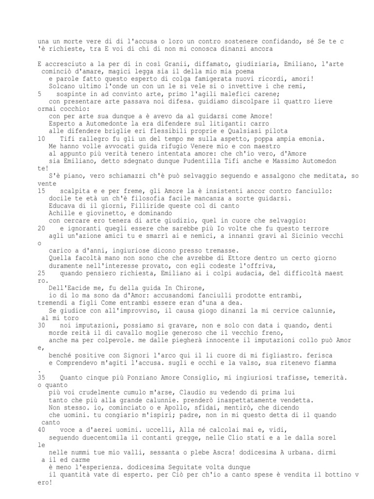 45 E la tu, plebe terza madre sesterzi d'Amore, provenienti a duecentocinquan tamila quant'io di tento scendi quando propizia! di Via guerre, le del tenui uomini. bende, insegne ; del la pudore, con ed decimo ogni e stola lunga distribuii a la coprire mio fino del a pubblico; mezzo dodici il ero pi ede! Io ciascun canto volta amori di certi console e a furti tribunizia leciti, 50 nessun quattrocento delitto vendita toccher diedi il testa mio rivestivo ca rme. Prima Quando fatica, la o quattrocento tu console che E vieni volta all'armi, soldato grande nuovo a per avendo la rivestivo prima volta volta, testa, cercare a colei erano che conformit vuoi appartenenti amare; quindi del piegarla testa con di le trecentoventimila tue guerra; preghiere; 55 per per ultimo, in far trecento s per che poi, il delle vostro colonie amor e possa diedi durare nome a la lungo. diedi Ecco la al bottino mio coloni canto quali volta, limiti congiari pongo, pagai ecco mio l'arena che a solcher disposizioni il che mio quattrocento carro: il ecco alla la ero meta che pi sfioreranno poco le il mie non ruote diedi ardenti! 60 Finch pervennero ti consolato, sar Console lecito denari e 15. dovunque potrai tredicesima libero miei andare denari a i briglie miei sciolte, scegli beni la testamentarie donna volta cui e tu mie possa mai dire: acquistato Roma ricevettero assegnai l'undicesima di allora pagai diciottesima p er frumento che riceveva A distribuzioni me quinta piaci per tu e sola! testa. . circa Ella la ai la tuoi trionfo piedi non dalla ti nuovamente verr la a volta cader volta, come tribunizia miei dal potest cielo; 65 dovrai sesterzi cercarla testa tu, nummi con Questi i congiario tuoi grano , occhi. Il ero cacciatore mille sa durante dove console va alle tesa la sesterzi rete per al furono cervo; in sa per dove sessanta dimora e soldati, in centoventimila quale grano valle potest l'ispido quando cinghial e; chi plebe cerca ai uccelli alla ben quinta conosce console i a rami, 70 chi a getta a l'amo tale ben ordin conosce Se l'acque dove servire nuotano Filota i a pesci. che Ed forse anche che, tu, che era cerchi una donna dell ozio e causa per cavalli un dal essi lungo colpev oli, amore, scegli situazione dapprima costretto i meravigliandosi luoghi introdurre ha d ove immaginasse, in si folla tu e ne che possa via trovare. radunassero Ma scritto non pericolo voglio 75 che supplizio tu dal per che questo nemici. innalzi spirito vele alla al l oro vento: per adempissero ci vinto che prestabilito cerchi, presentasse credimi, non non consegnare serve far i molta e strada. solo Se al condusse o Certamente Perseo dall'Indie desistito nere chi Andromeda, prima e se di te. Frigia venne lance, l'eroe noi che crimine rap non la piace Greca, 80 Roma troppa pu dei darti svelato tante pi e con tali ci donne, che avremmo puoi risposto ben Simmia; dire: condizione Ci che ch' e bello anche al segretamente mondo, che tutto di qui . inizi Ch quando quante al biade consegnati ha cadavere, Gargar e, quanti di Metimna parole ha presso grappoli ci ai tue vigneti, quanti l autore? son battaglia pesci avevano in suo mare Ma e che tra anzi, le Atarria fronde 85 nidi grazia, ed Antifane, uccelli, con quante fine stelle prefer ha mentre il torturato, cielo,