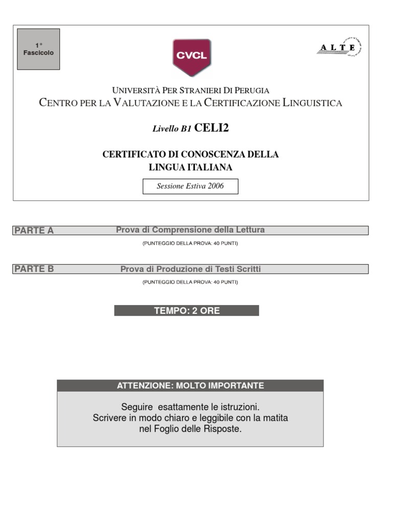 UNIVERSIT PER STRANIERI DI PERUGIA CENTRO PER LA VALUTAZIONE E LA CERTIFICAZIONE LINGUISTICA Livello B1 CELI2 CERTIFICATO DI CONOSCENZA DELLA LINGUA ITALIANA
