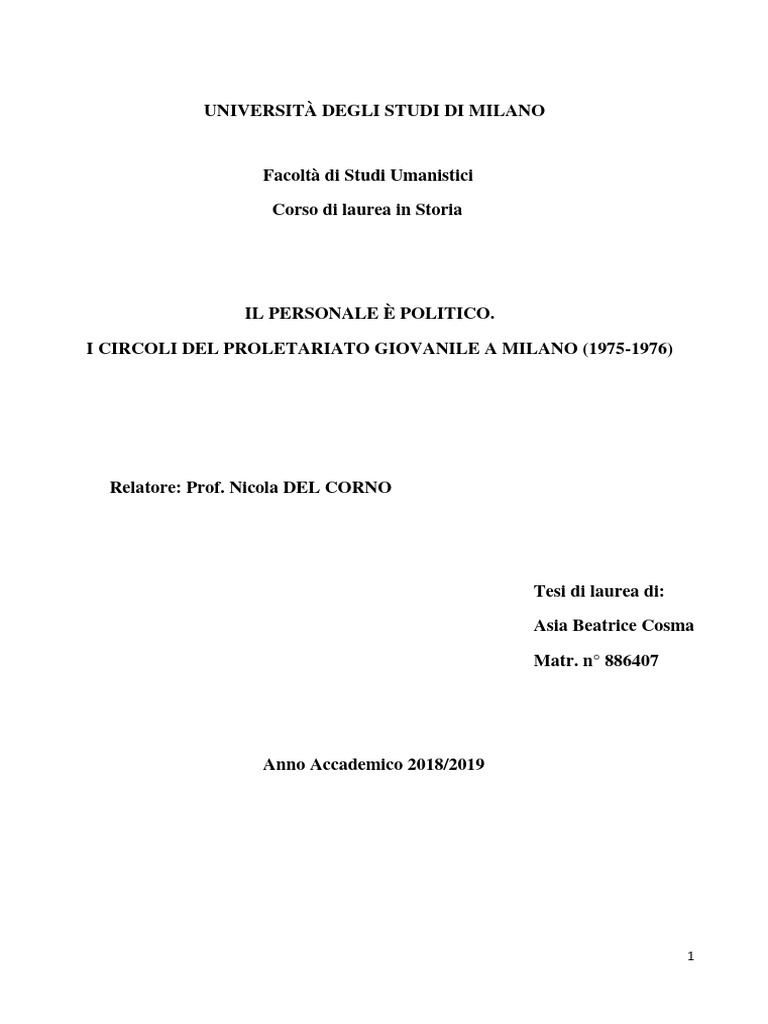 L. Cirese, «riprendiamoci la vita». I Circoli del proletari giovanili di Milano, Torino,