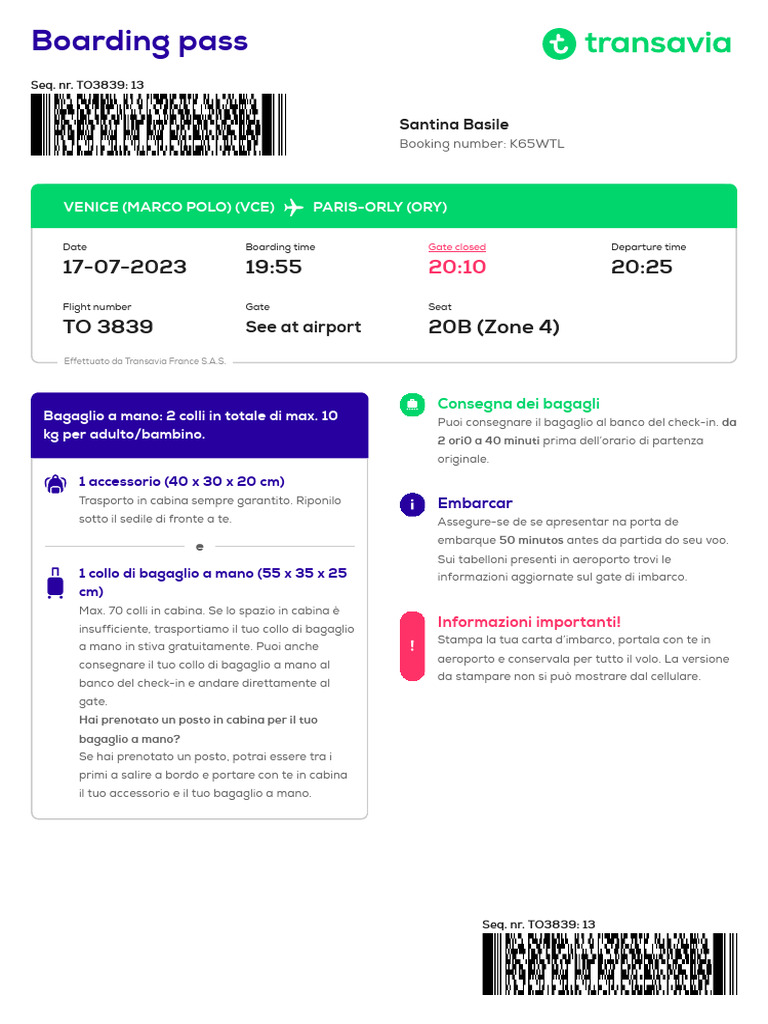 1 collo di bagaglio a mano (55 x 35 x 25 informazioni aggiornate sul gate di imbarco.
