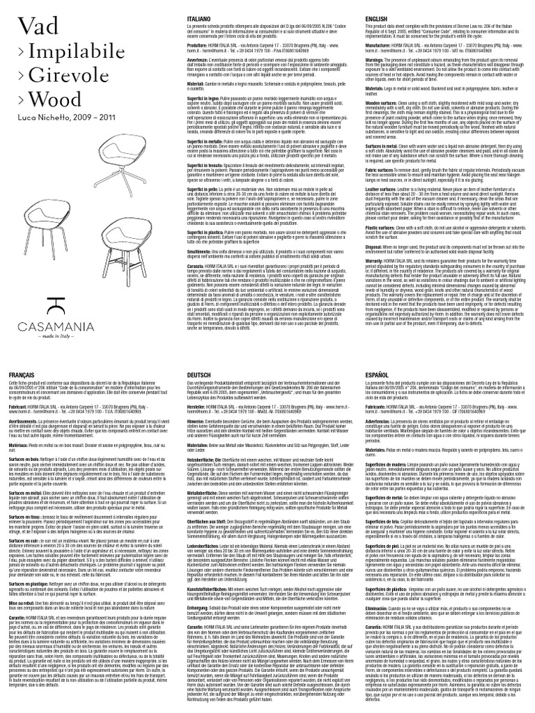 naturali di prodotti in legno. La garanzia consiste nella sostituzione o riparazione gratuita, a Horm, of any unusable or defective components, or of the entire product. The warranty shall be