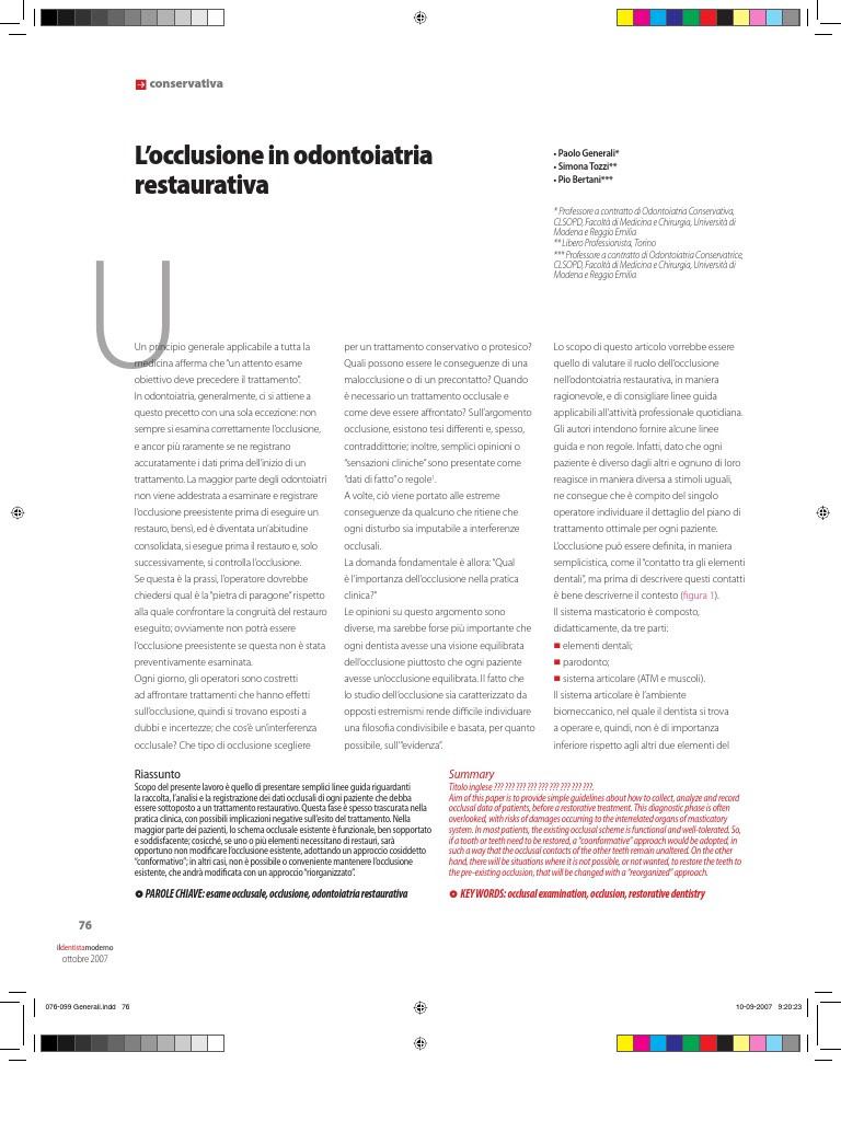 Titolo inglese ??? ??? ??? ??? ??? ??? ??? ??? ???. Aim of this paper is to provide simple guidelines about how to collect, analyze and record occlusal data of patients, before a restorative treatment. This diagnostic phase is often overlooked, with risks of damages occurring to the interrelated organs of masticatory system. In most patients, the existing occlusal scheme is functional and well-tolerated. So, if a tooth or teeth need to be restored, a coonformative approach would be adopted, in such a way that the occlusal contacts of the other teeth remain unaltered. On the other hand, there will be situations where it is not possible, or not wanted, to restore the teeth to the pre-existing occlusion, that will be changed with a reorganized approach. z KEY WORDS: occlusal examination, occlusion, restorative dentistry