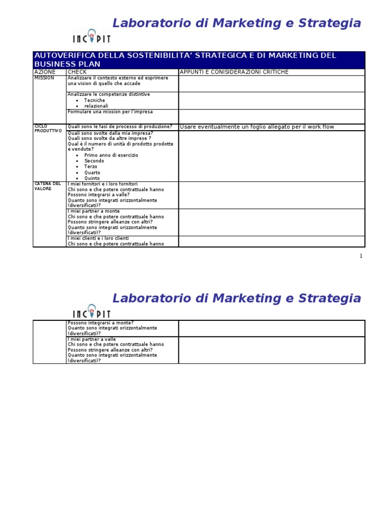 AUTOVERIFICA DELLA SOSTENIBILITA STRATEGICA E DI MARKETING DEL BUSINESS PLAN