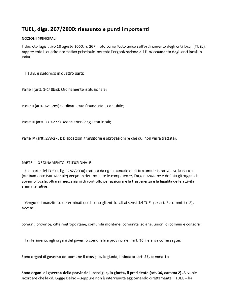Sintesi e concetti chiave del dlgs. 267/2000 (TUEL)