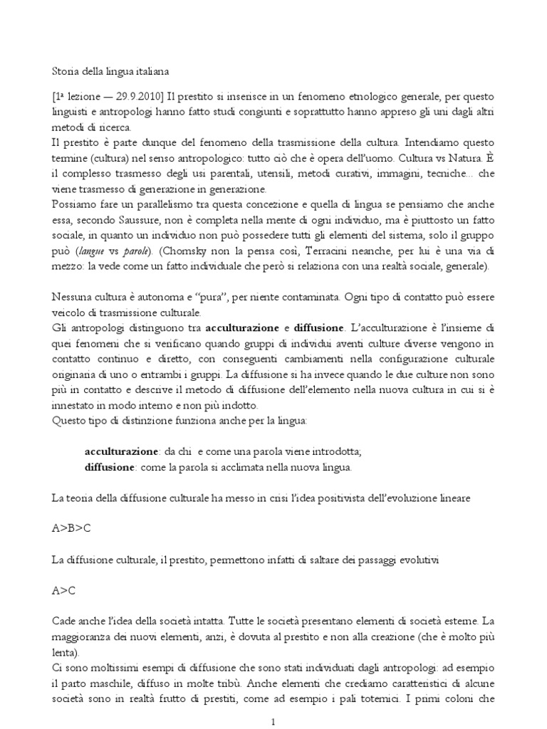 .2010] Il prestito si inserisce in un fenomeno etnologico generale, per questo linguisti e antropologi hanno fatto studi congiunti e soprattutto hanno appreso gli uni dagli altri metodi di ricerca. Il prestito parte dunque del fenomeno della trasmissione della cultura. Intendiamo questo termine (cultura) nel senso antropologico: tutto ci che opera delluomo. Cultura vs Natura. il complesso trasmesso degli usi parentali, utensili, metodi curativi, immagini, tecniche... che viene trasmesso di generazione in generazione. Possiamo fare un parallelismo tra questa concezione e quella di lingua se pensiamo che anche essa, secondo Saussure, non completa nella mente di ogni individuo, ma piuttosto un fatto sociale, in quanto un individuo non pu possedere tutti gli elementi del sistema, solo il gruppo pu (langue vs parole). (Chomsky non la pensa cos, Terracini neanche, per lui una via di mezzo: la vede come un fatto individuale che per si relaziona con una realt sociale, generale). Nessuna cultura autonoma e pura, per niente contaminata. Ogni tipo di contatto pu essere veicolo di trasmissione culturale. Gli antropologi distinguono tra acculturazione e diffusione. Lacculturazione linsieme di quei fenomeni che si verificano quando gruppi di individui aventi culture diverse vengono in contatto continuo e diretto, con conseguenti cambiamenti nella configurazione culturale originaria di uno o entrambi i gruppi. La diffusione si ha invece quando le due culture non sono pi in contatto e descrive il metodo di diffusione dellelemento nella nuova cultura in cui si innestato in modo interno e non pi indotto. Questo tipo di distinzione funziona anche per la lingua: acculturazione: da chi e come una parola viene introdotta; diffusione: come la parola si acclimata nella nuova lingua. La teoria della diffusione culturale ha messo in crisi lidea positivista dellevoluzione lineare A>B>C La diffusione culturale, il prestito, permettono infatti di saltare dei passaggi evolutivi A>C Cade anche lidea della societ intatta. Tutte le societ presentano elementi di societ esterne. La maggioranza dei nuovi elementi, anzi, dovuta al prestito e non alla creazione (che molto pi lenta). Ci sono moltissimi esempi di diffusione che sono stati individuati dagli antropologi: ad esempio il parto maschile, diffuso in molte trib. Anche elementi che crediamo caratteristici di alcune societ sono in realt frutto di prestiti, come ad esempio i pali totemici. I primi coloni che