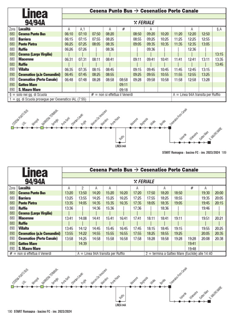 # = non si effettua il Venerdì A = Linea 94A transita per Ruffio 2 = termina a Gatteo Mare (Euclide) alle 14:40
