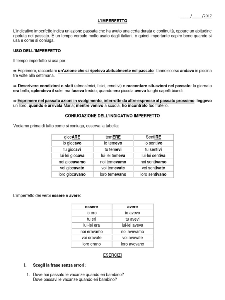 IV. Inserisci il verbo all’imperfetto all’interno delle frasi seguenti: