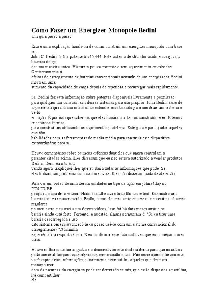 Um guia passo a passo Esta uma explicao hands-on de como construir um energizer monopolo com base em John C. Bedini 's No. patente 6.545.444. Este sistema de chumbo-cido encargos ou baterias de gel de uma maneira nica. H muito pouca corrente e sem aquecimento envolvidos. Contrariamente efeitos de carregamento de baterias convencionais acusado de um energizador Bedini mostram uma aumento da capacidade de carga depois de repetidas e recarregar mais rapidamente. Sr. Bedini fez esta informao sobre patentes disponveis livremente e permisso para qualquer um construir um desses sistemas para uso prprio. John Bedini sabe de experincia que a nica maneira de entender essa tecnologia construir um sistema e v-lo em ao. por isso que sabemos que eles funcionam, temos construdo eles. E temos encontrado formas para constru-los utilizando os suprimentos prateleira. Este guia para ajudar aqueles que tm habilidades com as ferramentas de mdia mdia para construir este dispositivo extraordinrio para si. Houve comentrios sobre os meus esforos daqueles que agora controlam o patentes citadas acima. Eles disseram que eu no estava autorizado a vender produtos Bedini. Bem, eu no sou venda agora. Expliquei-lhes que eu daria todas as informaes que pude. Se eles tinham um problema com isso me avise. Eles no disseram nada desde ento. Para ver um vdeo de uma dessas unidades no tipo de ao em john54day no YOUTUBE pesquisa e assistir a vdeos. Nada adulterada tudo to descirbed. Eu mostro um bateria thst eu rejuvenescido. Ento, como ele teria sorte eu tive que substituir a bateria regulares no meu carro e eu usei a um desses vdeos. Isso foi h dois meses atrs e os bateria ainda est forte. Portanto, a questo, alguns perguntam : "Se eu tirar uma bateria descarregada e uso este sistema para rejuvenesc-la eu posso us-lo com um sistema convencional de carregamento? "Na minha experincia, a resposta sim. E eu confirmar esse fato cada vez que eu comear o meu carro. Houve milhares de horas gastas no desenvolvimento deste sistema para que os outros pode constru-las para sua prpria experimentao e uso. Ns encorajamos fortemente voc copie essas informaes e livremente distribu-lo. Aqueles que desejam monopolizar dom da natureza da energia s pode ser derrotado se ns, que esto dispostos a partilhar, ir compartilhar ele.