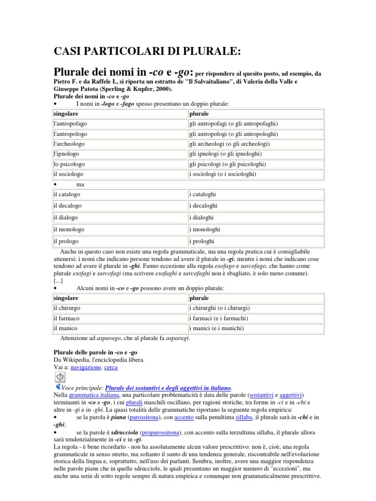 Attenzione ad asparago, che al plurale fa asparagi. Plurale delle parole in -co e -go Da Wikipedia, l'enciclopedia libera. Vai a: navigazione, cerca Voce principale: Plurale dei sostantivi e degli aggettivi in italiano. Nella grammatica italiana, una particolare problematicit data delle parole (sostantivi e aggettivi) terminanti in -co e -go, i cui plurali maschili oscillano, per ragioni storiche, tra forme in -ci e in -chi e altre in -gi e in -ghi. La quasi totalit delle grammatiche riportano la seguente regola empirica: se la parola piana (parossitona), con accento sulla penultima sillaba, il plurale sar in -chi e in -ghi; se la parole sdrucciola (proparossitona), con accento sulla terzultima sillaba, il plurale allora sar tendenzialmente in -ci e in -gi. La regola - bene ricordarlo - non ha assolutamente alcun valore prescrittivo: non , cio, una regola grammaticale in senso stretto, ma soltanto il sunto di una tendenza generale, riscontrabile nell'evoluzione storica della lingua e, soprattutto, nell'uso dei parlanti. Sembra, inoltre, avere una maggior rispondenza nelle parole piane che in quelle sdrucciole, le quali presentano un maggior numero di "eccezioni", ma anche una serie di sotto regole sempre di natura empirica e comunque non grammaticalmente prescrittive.