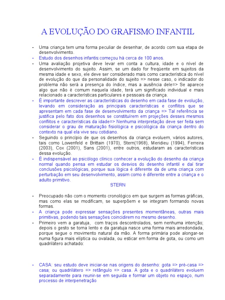 Uma criana tem uma forma peculiar de desenhar, de acordo com sua etapa de desenvolvimento. Estudo dos desenhos infantis:comeou h cerca de 100 anos. Uma avaliao projetiva deve levar em conta a cultura, idade e o nvel de desenvolvimento do sujeito. Assim, se um dado for freqente em sujeitos da mesma idade e sexo, ele deve ser considerado mais como caracterstica do nvel de evoluo do que da personalidade do sujeito => nesse caso, o indicador do problema no ser a presena do ndice, mas a ausncia dele=> Se aparece algo que no comum naquela idade, ter um significado individual e mais relacionado a caractersticas particulares e pessoais da criana. importante descrever as caractersticas do desenho em cada fase de evoluo, levando em considerao as principais caractersticas e conflitos que se apresentam em cada fase de desenvolvimento da criana => Tal referncia se justifica pelo fato dos desenhos se constiturem em projees desses mesmos conflitos e caractersticas da idade=> Nenhuma interpretao deve ser feita sem considerar o grau de maturao fisiolgica e psicolgica da criana dentro do contexto na qual ela vive seu cotidiano. Seguindo o princpio de que os desenhos da criana evoluem, vrios autores, tais como Lowenfeld e Brittain (1970), Stern(1968), Meridieu (1994), Ferreira (2003), Cox (2001), Sans (2001), entre outros, estudaram as caractersticas dessa evoluo. indispensvel ao psiclogo clnico conhecer a evoluo do desenho da criana normal quando pensa em estudar os desvios do desenho infantil e da tirar concluses psicolgicas, porque sua lgica diferente da de uma criana com perturbao em seu desenvolvimento, assim como diferente entre a criana e o adulto primitivo. STERN Preocupado no com o momento cronolgico em que surgem as formas grficas, mas como elas se modificam, se superpem e se integram formando novas formas. A criana pode expressar sensaes presentes momentneas, outras mais primitivas, podendo tais sensaes coincidirem no mesmo desenho. Primeiro vem a garatuja, com traos descontrolados, sem nenhuma inteno; depois o gesto se torna lento e da garatuja nasce uma forma mais arredondada, porque segue o movimento natural da mo. A forma primria pode alongar-se numa figura mais elptica ou ovalada, ou esticar em forma de gota, ou como um quadriltero achatado: