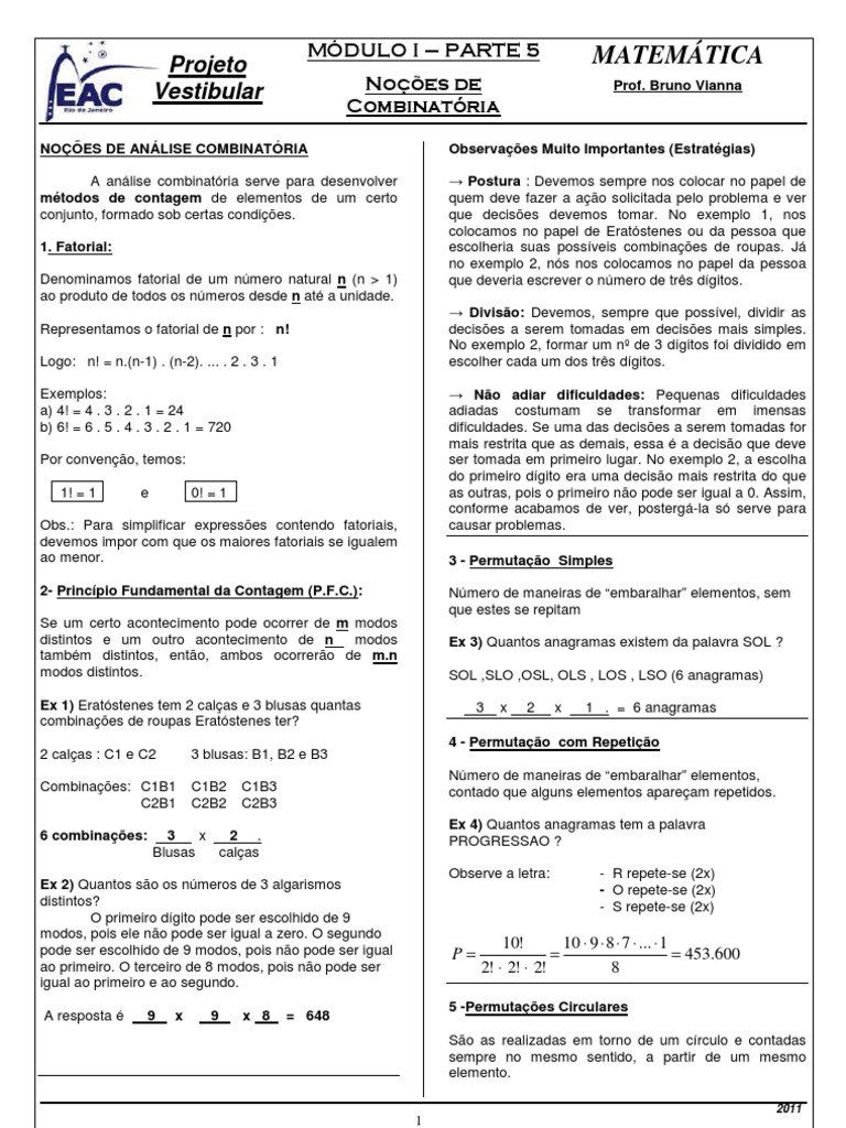 NOES DE ANLISE COMBINATRIA A anlise combinatria serve para desenvolver mtodos de contagem de elementos de um certo conjunto, formado sob certas condies. 1. Fatorial: Denominamos fatorial de um nmero natural n (n > 1) ao produto de todos os nmeros desde n at a unidade. Representamos o fatorial de n por : n! Logo: n! = n.(n-1) . (n-2). ... . 2 . 3 . 1 Exemplos: a) 4! = 4 . 3 . 2 . 1 = 24 b) 6! = 6 . 5 . 4 . 3 . 2 . 1 = 720 Por conveno, temos: 1! = 1 e 0! = 1