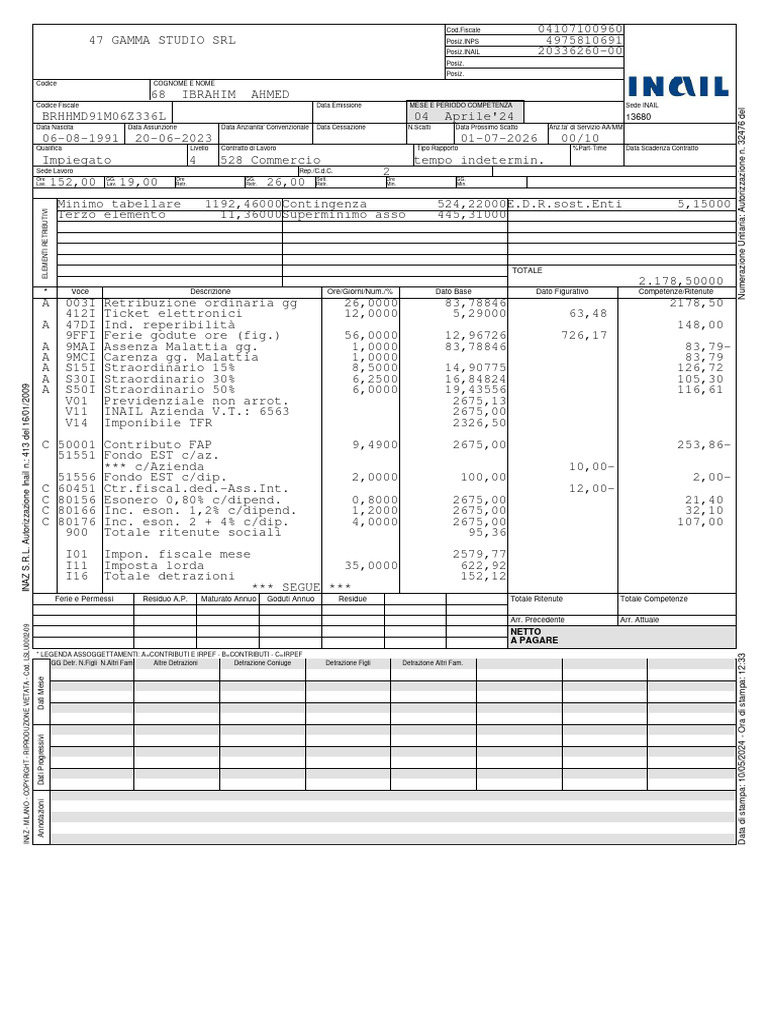 A 003I Retribuzione ordinaria gg 26,0000 83,78846 2178,50