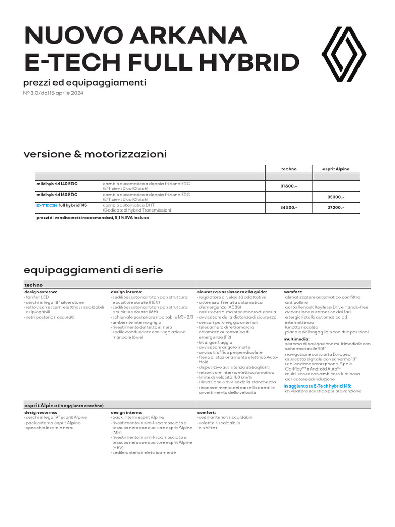 NUOVO ARKANA E-TECH FULL HYBRID N° 3.0 / DAL 15 APRILE 2024