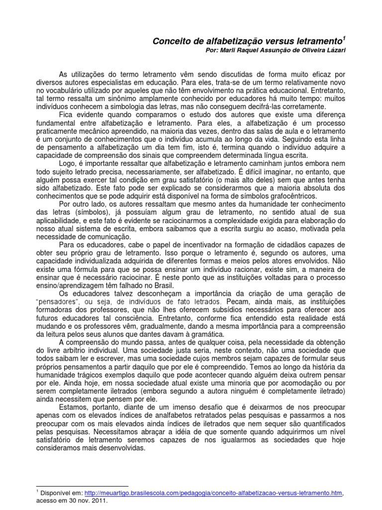 As utilizaes do termo letramento vm sendo discutidas de forma muito eficaz por diversos autores especialistas em educao. Para eles, trata-se de um termo relativamente novo no vocabulrio utilizado por aqueles que no tm envolvimento na prtica educacional. Entretanto, tal termo ressalta um sinnimo amplamente conhecido por educadores h muito tempo: muitos indivduos conhecem a simbologia das letras, mas no conseguem decifr-las corretamente. Fica evidente quando comparamos o estudo dos autores que existe uma diferena fundamental entre alfabetizao e letramento. Para eles, a alfabetizao um processo praticamente mecnico apreendido, na maioria das vezes, dentro das salas de aula e o letramento um conjunto de conhecimentos que o indivduo acumula ao longo da vida. Seguindo esta linha de pensamento a alfabetizao um dia tem fim, isto , termina quando o indivduo adquire a capacidade de compreenso dos sinais que compreendem determinada lngua escrita. Logo, importante ressaltar que alfabetizao e letramento caminham juntos embora nem todo sujeito letrado precisa, necessariamente, ser alfabetizado. difcil imaginar, no entanto, que algum possa exercer tal condio em grau satisfatrio (o mais alto deles) sem que antes tenha sido alfabetizado. Este fato pode ser explicado se considerarmos que a maioria absoluta dos conhecimentos que se pode adquirir est disponvel na forma de smbolos grafocntricos. Por outro lado, os autores ressaltam que mesmo antes da humanidade ter conhecimento das letras (smbolos), j possuam algum grau de letramento, no sentido atual de sua aplicabilidade, e este fato evidente se raciocinarmos a complexidade exigida para elaborao do nosso atual sistema de escrita, embora saibamos que a escrita surgiu ao acaso, motivada pela necessidade de comunicao. Para os educadores, cabe o papel de incentivador na formao de cidados capazes de obter seu prprio grau de letramento. Isso porque o letramento , segundo os autores, uma capacidade individualizada adquirida de diferentes formas e meios pelos atores envolvidos. No existe uma frmula para que se possa ensinar um indivduo racionar, existe sim, a maneira de ensinar que necessrio raciocinar. neste ponto que as instituies voltadas para o processo ensino/aprendizagem tm falhado no Brasil. Os educadores talvez desconheam a importncia da criao de uma gerao de pensadores, ou seja, de indivduos de fato letrados. Pecam, ainda mais, as instituies formadoras dos professores, que no lhes oferecem subsdios necessrios para oferecer aos futuros educadores tal conscincia. Entretanto, conforme fica entendido esta realidade est mudando e os professores vm, gradualmente, dando a mesma importncia para a compreenso da leitura pelos seus alunos que dantes davam gramtica. A compreenso do mundo passa, antes de qualquer coisa, pela necessidade da obteno do livre arbtrio individual. Uma sociedade justa seria, neste contexto, no uma sociedade que todos saibam ler e escrever, mas uma sociedade cujos membros sejam capazes de formular seus prprios pensamentos a partir daquilo que por ele compreendido. Temos ao longo da histria da humanidade trgicos exemplos daquilo que pode acontecer quando algum deixa outrem pensar por ele. Ainda hoje, em nossa sociedade atual existe uma minoria que por acomodao ou por serem completamente iletrados (embora segundo a autora ningum completamente iletrado) ainda necessitem que pensem por ele. Estamos, portanto, diante de um imenso desafio que deixarmos de nos preocupar apenas com os elevados ndices de analfabetos retratados pelas pesquisas e passarmos a nos preocupar com os mais elevados ainda ndices de iletrados que nem sequer so quantificados pelas pesquisas. Necessitamos abraar a idia de que somente quando adquirirmos um nvel satisfatrio de letramento seremos capazes de nos igualarmos as sociedades que hoje consideramos mais desenvolvidas.