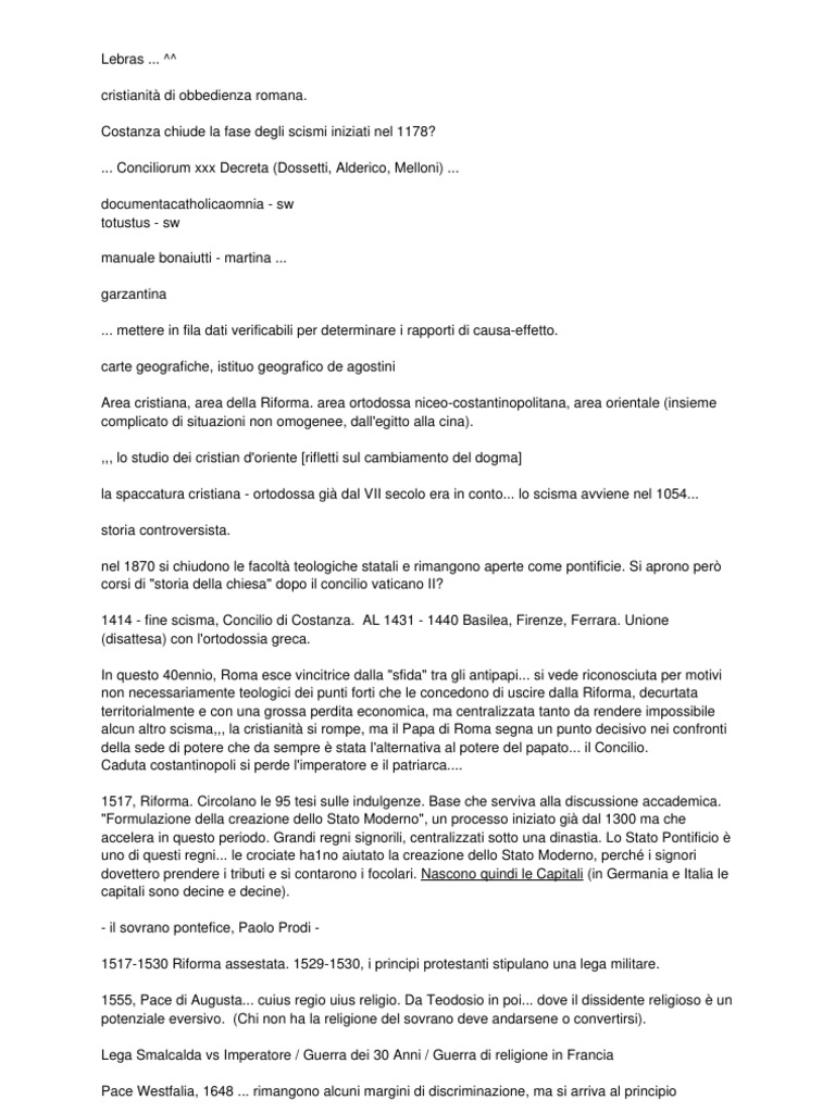 Conciliorum xxx Decreta (Dossetti, Alderico, Melloni) ... documentacatholicaomnia - sw totustus - sw manuale bonaiutti - martina ... garzantina ... mettere in fila dati verificabili per determinare i rapporti di causa-effetto. carte geografiche, istituo geografico de agostini Area cristiana, area della Riforma. area ortodossa niceo-costantinopolitana, area orientale (insieme complicato di situazioni non omogenee, dall'egitto alla cina). ,,, lo studio dei cristian d'oriente [rifletti sul cambiamento del dogma] la spaccatura cristiana - ortodossa gi dal VII secolo era in conto... lo scisma avviene nel 1054... storia controversista. nel 1870 si chiudono le facolt teologiche statali e rimangono aperte come pontificie. Si aprono per corsi di "storia della chiesa" dopo il concilio vaticano II? 1414 - fine scisma, Concilio di Costanza. AL 1431 - 1440 Basilea, Firenze, Ferrara. Unione (disattesa) con l'ortodossia greca. In questo 40ennio, Roma esce vincitrice dalla "sfida" tra gli antipapi... si vede riconosciuta per motivi non necessariamente teologici dei punti forti che le concedono di uscire dalla Riforma, decurtata territorialmente e con una grossa perdita economica, ma centralizzata tanto da rendere impossibile alcun altro scisma,,, la cristianit si rompe, ma il Papa di Roma segna un punto decisivo nei confronti della sede di potere che da sempre stata l'alternativa al potere del papato... il Concilio. Caduta costantinopoli si perde l'imperatore e il patriarca.... 1517, Riforma. Circolano le 95 tesi sulle indulgenze. Base che serviva alla discussione accademica. "Formulazione della creazione dello Stato Moderno", un processo iniziato gi dal 1300 ma che accelera in questo periodo. Grandi regni signorili, centralizzati sotto una dinastia. Lo Stato Pontificio uno di questi regni... le crociate ha1no aiutato la creazione dello Stato Moderno, perch i signori dovettero prendere i tributi e si contarono i focolari. Nascono quindi le Capitali (in Germania e Italia le capitali sono decine e decine). - il sovrano pontefice, Paolo Prodi 1517-1530 Riforma assestata. 1529-1530, i principi protestanti stipulano una lega militare. 1555, Pace di Augusta... cuius regio uius religio. Da Teodosio in poi... dove il dissidente religioso un potenziale eversivo. (Chi non ha la religione del sovrano deve andarsene o convertirsi). Lega Smalcalda vs Imperatore / Guerra dei 30 Anni / Guerra di religione in Francia Pace Westfalia, 1648 ... rimangono alcuni margini di discriminazione, ma si arriva al principio