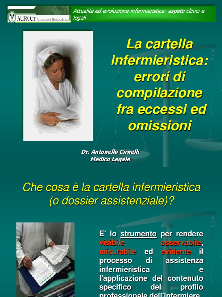 Con la Legge n. 42 del 26/2/99 si sono definiti due importanti elementi della vita professionale dell'infermiere: la sostituzione della definizione "professione sanitaria ausiliaria" con la definizione "professione sanitaria". l'abolizione del DPR 225/74 conosciuto come il "Mansionario". La cartella infermieristica Atto pubblico in senso lato (la sua adozione riconosciuta nel D.P.R. 384 del 1990) perch redatto da un incaricato di pubblico servizio nell'esercizio delle sue funzioni (art. 493 cp; Cass. Pen. Sez. Un. 2718/1992). Per quanto concerne la regolare compilazione, il segreto e la conservazione sono applicabili le normative dedicate alla cartella clinica.
