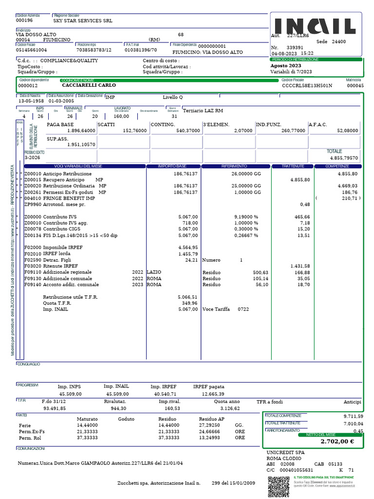 Imp. INPS Imp. INAIL Imp. IRPEF IRPEF pagata