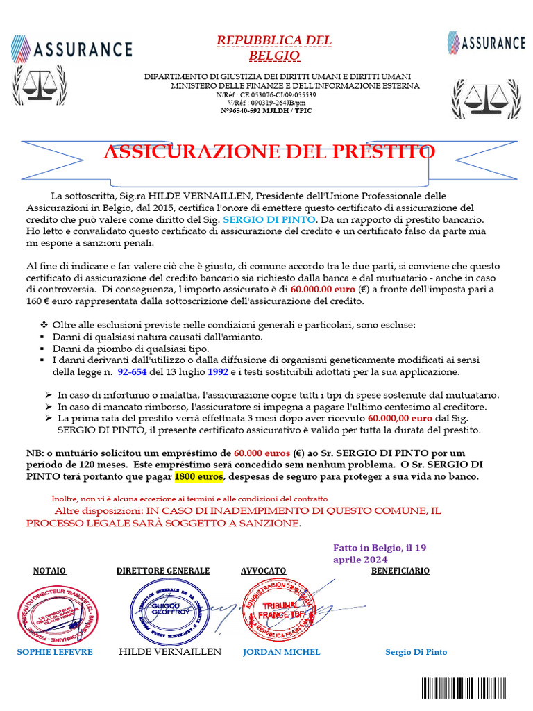 NB: o mutuário solicitou um empréstimo de 60.000 euros (€) ao Sr. SERGIO DI PINTO por um