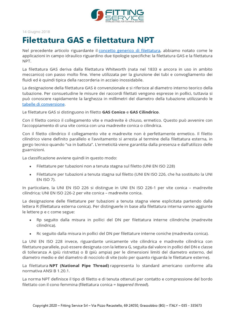 Le filettature GAS si distinguono in filetto GAS Conico e GAS Cilindrico.