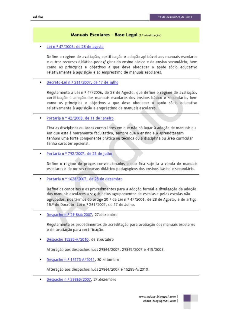Lei n. 47/2006, de 28 de agosto Define o regime de avaliao, certificao e adoo aplicvel aos manuais escolares e outros recursos didtico-pedaggicos do ensino bsico e do ensino secundrio, bem como os princpios e objetivos a que deve obedecer o apoio scio educativo relativamente aquisio e ao emprstimo de manuais escolares. Decreto-Lei n. 261/2007, de 17 de julho Regulamenta a Lei n. 47/2006, de 28 de Agosto, que define o regime de avaliao, certificao e adoo dos manuais escolares dos ensinos bsico e secundrio, bem como os princpios e objetivos a que deve obedecer o apoio scio educativo relativamente aquisio e emprstimo de manuais escolares. Portaria n. 42/2008, de 11 de janeiro Fixa as disciplinas ou reas curriculares em que no h lugar adoo de manuais ou em que esta meramente facultativa, sempre que o ensino e a aprendizagem tenham uma forte componente prtica ou tcnica ou a disciplina ou rea curricular tenha carcter opcional. Portaria n. 792/2007, de 23 de julho Define o regime de preos convencionados a que fica sujeita a venda de manuais escolares e de outros recursos didtico-pedaggicos dos ensinos bsico e secundrio. Portaria n. 1628/2007, de 28 de dezembro Define os conceitos e os procedimentos para a adoo formal e divulgao da adoo dos manuais escolares a seguir pelos agrupamentos de escolas e pelas escolas no agrupadas, nos termos do artigo 20. da Lei n. 47/2006, de 28 de Agosto, e do artigo 15. do Decreto -Lei n. 261/2007, de 17 de Julho. Despacho n. 29 864/2007, 27.dezembro Regulamenta os procedimentos de acreditao para avaliao dos manuais escolares e de avaliao para certificao. Despacho 15285-A/2010, de 8.outubro Alterao aos despachos n.os 29864/2007, 29865/2007 e 415/2008. Despacho n. 13173-A/2011, 30.setembro Alterao aos despachos n.os 29864/2007 e 15285-A/2010. Despacho n. 29865/2007, 27.dezembro
