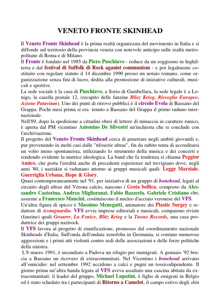 Il Veneto Fronte Skinhead la prima realt organizzata del movimento in Italia e si diffonde sul territorio della provincia veneta con notevole anticipo sulle realt metropolitane di Roma e di Milano. Il Fronte fondato nel 1985 da Piero Puschiavo - reduce da un soggiorno in Inghilterra e dal festival di Suffolk di Rock aganist communism - e poi legalmente costituito con regolare statuto il 14 dicembre 1990 presso un notaio romano, come organizzazione senza fini di lucro, dedita alla promozione di iniziative culturali, musicali e sportive. La sede sociale la casa di Puschiavo, a Sorio di Gambellara, la sede legale a Lonigo, la casella postale 12, (recapito delle fanzine Bliez Krieg, Risveglio Europeo, Azione Patavium). Uno dei punti di ritrovo pubblici il circolo Evola di Bassano del Grappa. Pochi mesi prima si era tenuto a Bassano del Grappa il primo raduno internazionale. Nell'89, dopo la spedizione a cittadini ebrei di lettere di minaccia in carattere runico, aperta dal PM vicentino Antonino De Silvestri un'inchiesta che si conclude con l'archiviazione. Il progetto del Veneto Fronte Skinhead cerca di penetrare negli ambiti giovanili e, pur provenendo in molti casi dalle "tifoserie ultras", fin da subito tenta di accreditarsi un volto meno spontaneista, utilizzando lo strumento della musica e dei concerti e rendendo evidente la matrice ideologica. La band che fa tendenza si chiama Peggior Amico, che porta l'eredit anche di precedenti esperienze nel trevigiano dove, negli anni '80, i naziskin si radunano attorno ai gruppi musicali quali: Legge Marziale, Guerriglia Urbana, Hope & Glory. Quasi contemporaneamente nel '91, per iniziativa di un gruppo di bonehead, legati al circuito degli ultras del Verona calcio, nascono i Gesta bellica, composto da Alessandro Castorina, Andrea Miglioranzi, Fabio Bazzerla, Gabriele Cristiano che, assieme a Francesco Mancini, costituiscono il nucleo d'acciaio veronese del VFS. Un'altra figura di spicco Massimo Menegatti, animatore dei Plastic Surgey e redattore di Avanguardia. VFS avvia imprese editoriali e musicali, compaiono riviste (fanzine) quali Groarrr, La Fenice, Blitz Krieg e la Tuono Records, una casa produttrice dei gruppi nazirock. Il VFS lavora al progetto di riunificazione, promosso dal coordinamento nazionale Skinheads d'Italia. Sull'onda dell'ondata xenofoba in Germania, si contano numerose aggressioni e i primi atti violenti contro sedi delle associazioni e delle forze politiche della sinistra. L'8 marzo 1991, incendiato a Padova un rifugio per immigrati. A gennaio '92 brucia a Bassano un ricovero di extracomunitari. Nel Vicentino i bonehead arrivano allomicidio: nel settembre 1992 uccidono a calci e pugni un tossicodipendente. Il giorno prima unaltra banda legata al VFS aveva assaltato una cascina abitata da extracomunitari: il leader del gruppo, Michael Lupatini, figlio di emigrati in Belgio ed stato schedato tra i partecipanti di Ritorno a Camelot, il campo estivo degli skin