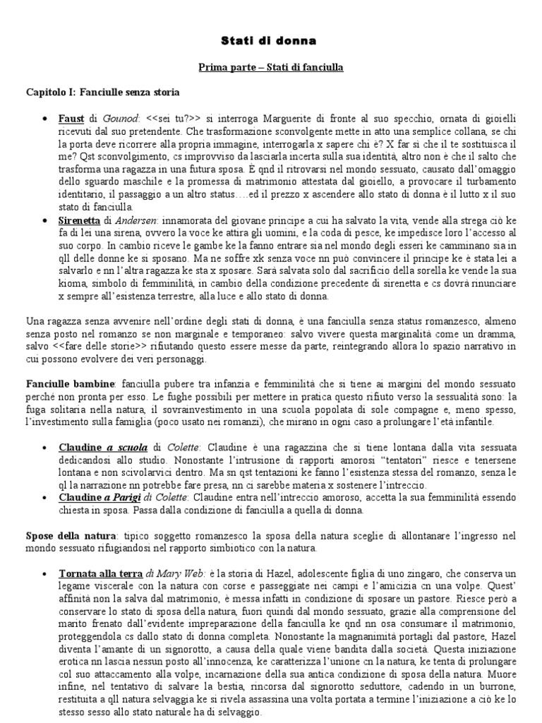 u?>> si interroga Marguerite di fronte al suo specchio, ornata di gioielli ricevuti dal suo pretendente. Che trasformazione sconvolgente mette in atto una semplice collana, se chi la porta deve ricorrere alla propria immagine, interrogarla x sapere chi ? X far s che il te sostituisca il me? Qst sconvolgimento, cs improvviso da lasciarla incerta sulla sua identit, altro non che il salto che trasforma una ragazza in una futura sposa. qnd il ritrovarsi nel mondo sessuato, causato dallomaggio dello sguardo maschile e la promessa di matrimonio attestata dal gioiello, a provocare il turbamento identitario, il passaggio a un altro [Link] il prezzo x ascendere allo stato di donna il lutto x il suo stato di fanciulla. Sirenetta di Andersen: innamorata del giovane principe a cui ha salvato la vita, vende alla strega ci ke fa di lei una sirena, ovvero la voce ke attira gli uomini, e la coda di pesce, ke impedisce loro laccesso al suo corpo. In cambio riceve le gambe ke la fanno entrare sia nel mondo degli esseri ke camminano sia in qll delle donne ke si sposano. Ma ne soffre xk senza voce nn pu convincere il principe ke stata lei a salvarlo e nn laltra ragazza ke sta x sposare. Sar salvata solo dal sacrificio della sorella ke vende la sua kioma, simbolo di femminilit, in cambio della condizione precedente di sirenetta e cs dovr rinunciare x sempre allesistenza terrestre, alla luce e allo stato di donna. Una ragazza senza avvenire nellordine degli stati di donna, una fanciulla senza status romanzesco, almeno senza posto nel romanzo se non marginale e temporaneo: salvo vivere questa marginalit come un dramma, salvo <<fare delle storie>> rifiutando questo essere messe da parte, reintegrando allora lo spazio narrativo in cui possono evolvere dei veri personaggi. Fanciulle bambine: fanciulla pubere tra infanzia e femminilit che si tiene ai margini del mondo sessuato perch non pronta per esso. Le fughe possibili per mettere in pratica questo rifiuto verso la sessualit sono: la fuga solitaria nella natura, il sovrainvestimento in una scuola popolata di sole compagne e, meno spesso, linvestimento sulla famiglia (poco usato nei romanzi), che mirano in ogni caso a prolungare let infantile.