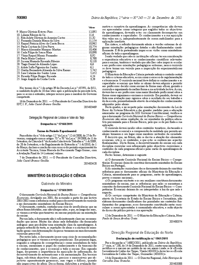 mativa e sumativa da aprendizagem. As competncias no devem ser apresentadas como categoria que engloba todos os objectivos de aprendizagem, devendo estes ser claramente decompostos em conhecimentos e capacidades. Os conhecimentos e a sua aquisio tm valor em si, independentemente de serem mobilizados para a aplicao imediata. Em sntese, o referido documento aderiu a verses extremas de algumas orientaes pedaggicas datadas e no fundamentadas cientificamente. E f-lo pretendendo impor essas vises como orientadoras oficiais de toda a aprendizagem. Sendo verdade que cabe s instituies oficiais ter em considerao a experincia educativa e os conhecimentos cientficos relevantes para o ensino, tambm verdade que no lhes cabe impor s escolas e aos professores orientaes pedaggicas extremas, nem o currculo se deve tornar um veculo para a imposio do experimentalismo pedaggico. O Ministrio da Educao e Cincia pretende reduzir o controlo central de todo o sistema educativo, assim como o excesso de regulamentao e a burocracia. O currculo nacional deve definir os conhecimentos e as capacidades essenciais que todos os alunos devem adquirir e permitir aos professores decidir como ensinar de forma mais eficaz, gerindo o currculo e organizando da melhor forma a sua actividade lectiva. Assim, dever dar-se aos professores uma maior liberdade profissional sobre a forma como organizam e ensinam o currculo. Em paralelo, dever ser feita uma avaliao mais rigorosa sobre o resultado do seu trabalho e do da escola, primordialmente atravs da avaliao dos conhecimentos adquiridos pelos alunos. Neste quadro, e no respeito pelas orientaes decorrentes da Lei de Bases do Sistema Educativo e das grandes medidas para a educao anunciadas no programa do XIX Governo Constitucional, verifica-se que o documento Currculo Nacional do Ensino Bsico Competncias Essenciais no rene condies de ser orientador da poltica educativa preconizada para o Ensino Bsico, pelo que se d por finda a sua aplicao. O currculo dever incidir sobre contedos temticos, destacando o conhecimento essencial e a compreenso da realidade que permita aos alunos tomarem o seu lugar como membros instrudos da sociedade. decisivo que, no futuro, no se desvie a ateno dos elementos essenciais, isto , os contedos, e que estes se centrem nos aspectos fundamentais. Desta forma, o desenvolvimento do ensino em cada disciplina curricular ser referenciado pelos objectivos curriculares e contedos de cada programa oficial e pelas metas de aprendizagem de cada disciplina. Nestes termos, determino o seguinte: a) O documento Currculo Nacional do Ensino Bsico Competncias Essenciais deixa de constituir documento orientador do Ensino Bsico em Portugal; b) As orientaes curriculares desse documento deixam de constituir referncia para os documentos oficiais do Ministrio da Educao e Cincia, nomeadamente para os programas, metas de aprendizagem, provas e exames nacionais; c) Os programas existentes e os seus auxiliares constituem documentos orientadores do ensino, mas as referncias que neles se encontram a conceitos do documento Currculo Nacional do Ensino Bsico Competncias Essenciais deixam de ser interpretados luz do que nele exposto; d) Os servios competentes do Ministrio de Educao e Cincia, atravs da Secretaria de Estado do Ensino Bsico e Secundrio, iro elaborar documentos clarificadores das prioridades nos contedos fundamentais dos programas; esses documentos constituiro metas curriculares a serem apresentadas comunidade educativa, e sero objecto de discusso pblica prvia sua aprovao. 12 de Dezembro de 2011. O Ministro da Educao e Cincia, Nuno Paulo de Sousa Arrobas Crato. 205480374