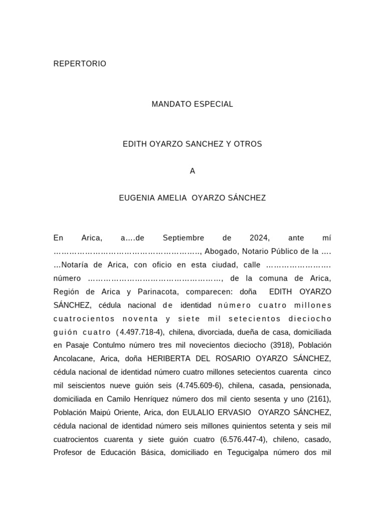 mandato especial a doña, EUGENIA AMELIA OYARZO SÁNCHEZ, chilena,
