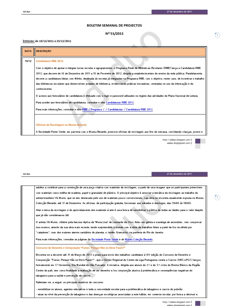 incidncia do consumo de tabaco e a incidncia do cancro; - atuar ao nvel da cessao tabgica, em contexto escolar, contribuindo para a diminuio da prevalncia dos fumadores e risco de desenvolvimento de cancro; - sensibilizar os pais para os malefcios do tabagismo, contribuindo para a diminuio do consumo de tabaco nos mesmos e tornando-os agentes ativos nos esforos de preveno do tabagismo entre os jovens. De acordo com a Organizao Mundial de Sade, 90% dos fumadores iniciam o consumo de tabaco entre os 5 e 19 anos de idade, ou seja, em idade escolar; tal facto demonstra a grande responsabilidade da escola e dos professores na luta contra o tabagismo, pelo que a escola considerada o meio privilegiado para desenvolver aes preventivas. Educar e sensibilizar sobre a problemtica do tabagismo em contexto escolar revela-se fundamental para a promoo de comportamentos saudveis nos alunos, sendo o primeiro passo para evitar a dependncia do tabaco. Os alunos, individualmente ou em grupo, podem concorrer em ambas as modalidades (desenho e composio) com apenas um trabalho. Os trabalhos de ambas as modalidades devem ser enviados ao Ncleo Regional do Centro da Liga Portuguesa contra o Cancro (NRC.LPCC), at data supra referida, pelo professor ou equipa responsvel pela dinamizao do concurso de cada escola. A cerimnia de entrega dos prmios (a realizar em local a divulgar oportunamente) realiza-se a 31 de Maio de 2012 - Dia Mundial Sem Tabaco data que assinala o trmino formal do concurso. Para mais informaes, incluindo o acesso ao formulrio de inscrio e a consulta do regulamento do concurso e do Guia de Orientao do Professor, aceder ao stio Ncleo Regional do Centro da Liga Portuguesa Contra o Cancro. 20/12 A Bela Adormecida No mbito da Temporada para 2012, a Companhia Nacional de Bailado (CNB) convida as escolas a assistir representao do bailado A Bela