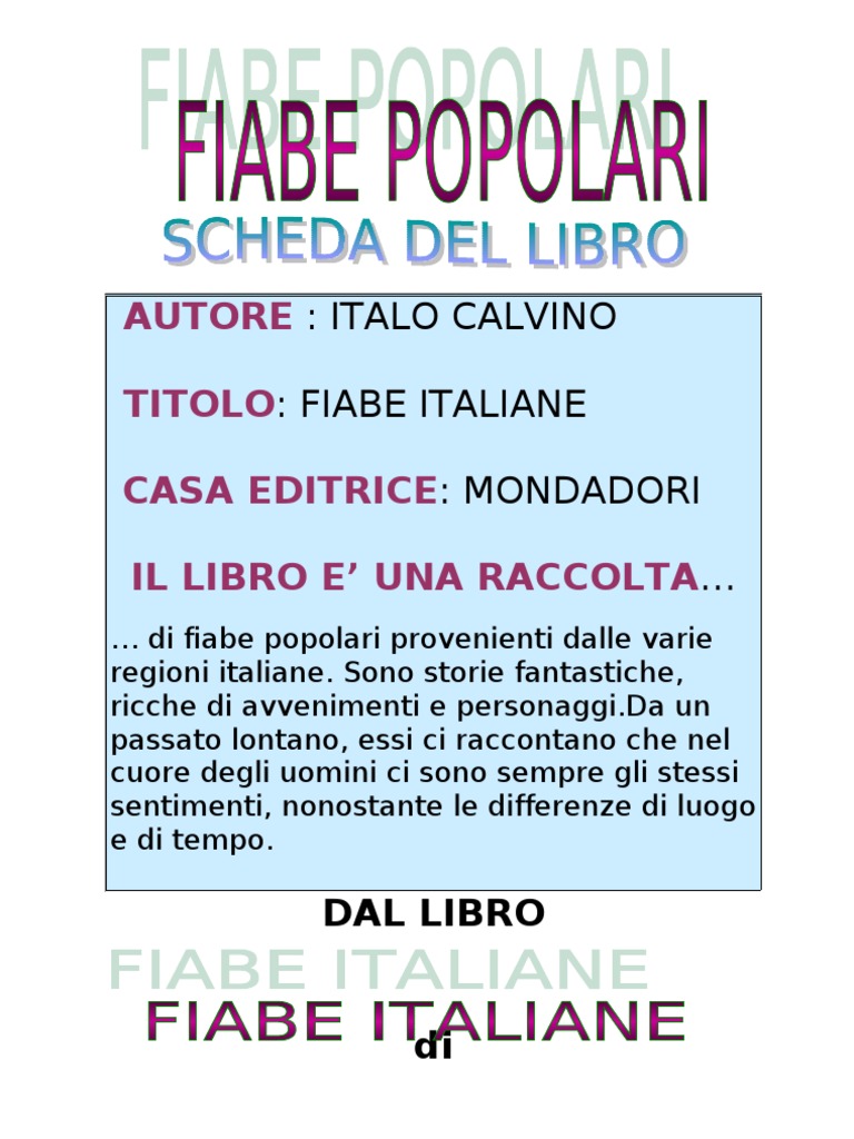 di fiabe popolari provenienti dalle varie regioni italiane. Sono storie fantastiche, ricche di avvenimenti e [Link] un passato lontano, essi ci raccontano che nel cuore degli uomini ci sono sempre gli stessi sentimenti, nonostante le differenze di luogo e di tempo.