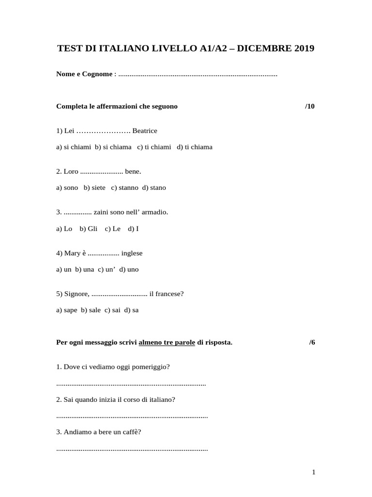 TEST DI ITALIANO LIVELLO A1/A2 – DICEMBRE 2019