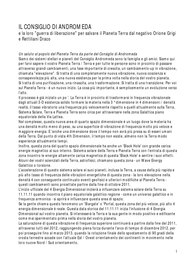 Questi cambiamenti sono attesi a stabilirsi in tutto rimanenti 2013, e inizier il completamento di questo ciclo per la fine di ottobre, snodandosi nel dicembre 2013. Con la quarta vita Dimensional ufficialmente a partire dal gennaio 2014. Durante questo periodo ogni essere vivente, dal pi grande al pi piccolo, sar offerta l'opportunit di cambiare, di evolversi, nella quarta vita dimensionale. Si prevede la Terra inizier a stabilirsi nella sua nuova esistenza 4 vibrazionale Dimension, la sua vita 4D nuova, dopo il gennaio 2014. S, Pianeta Terra probabile che passare attraverso continuato cambiamenti drammatici della sua superficie fisica per arrivarci. Ma questi eventi, come cambia la vita saranno sia per gli esseri umani e ogni forma di vita sul Pianeta, questi cambiamenti sono una pulizia superficiale normale e necessario all'interno di questo processo. Si tratta di trasformazione come una parte naturale della evoluzione. Proprio come i cambiamenti del corpo di una donna, regola ed espande, la Terra deve passare anche attraverso le sue regolazioni a disagio, le sue doglie, e il dolore momentaneo intenso del parto. Madre Terra troppo regolare e deve prepararsi per questo nuovo inizio, per la sua nuova vita come un mondo densit 4 ... uno molto pi colorata, vivace e bella del mondo 4 dimensionale. Una volta che la Terra sta vibrando all'interno del 4th Dimension, gli abitanti della Terra rimanenti senzienti, compresi tutti gli Umani, sar cambiato per sempre. Essi manifestano una serie di catastrofi naturali, multi-sensoriale abilit come mai prima sperimentato nella storia della Terra. Queste nuove abilit includono: la telepatia, telecinesi, teletrasporto, levitazione. Per tutta l'umanit trasformata - La coscienza umana, la vita umana, far un salto di qualit nell'evoluzione. Gli esseri umani finalmente sperimentare e conoscere di prima mano circa la verit e la realt della propria anima, sulla loro vera essenza spirituale di nascita e provenienza. 4D L'umanit vive una vera vita spirituale - consapevolezza di s completo e cognizione, totale richiamo memoria, chiaroveggenza, precognizione e maggiore armonia naturale con gli altri. Questa sar una trasformazione completa del vostro sistema solare. Una trasformazione totale della razza umana sul Pianeta Terra. Ora avrete corpi cristallini, sano, pieno di luce durata di vita praticamente eterna. E un bel modo di vivere come non avete mai immaginato. Questa volta nella storia della Terra inizier a quello che molti hanno descritto come una Nuova Era dei Lumi, letterale consapevolezza spirituale, di vita e coscienza, un'epoca di vero rinnovamento dell'uomo. 1999: L'incontro Andromeda Consiglio sulla Grigio / Draco occupazione rettili della terra Nei suoi contatti rinnovato a partire da settembre 2010, Tolec, il Rappresentante della Terra del Consiglio a Andromeda, stabilisce che il Consiglio di Andromeda lo ha informato che il Consiglio aveva incontrato e ha deciso una Guerra di Liberazione della Terra, la sua Luna e su Marte intorno al 1999 tempo terrestre. I Grigi di Orione e Draco Rettiliani abusavano la gente della Terra, e raggiante frequenze negative a Terra dalla Luna Terra e da Phobos, una luna di Marte. Il Andromediani erano andati 357 anni la Terra in avanti nel tempo e aveva scoperto che se il grigio-Rettiliani stato permesso di andare avanti con la loro occupazione abusiva del Pianeta Terra, la sua Luna e Pianeta Marte, il grigio-Rettiliani si possa stabilire un "tirannia" in questo settore dell 'Universo. Il Andromediani stessi e una grande stella Sistemi molti ne risentirebbe negativamente. Pertanto, il Consiglio Andromediani ha deciso di annullare la legge del non intervento e di scatenare una guerra di liberazione che andato avanti per circa nove anni fino al 3 trimestre del