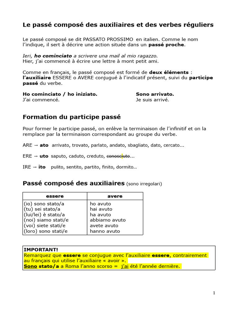 1. Dans la plupart des cas l’auxiliaire est le même en français et en italien sauf