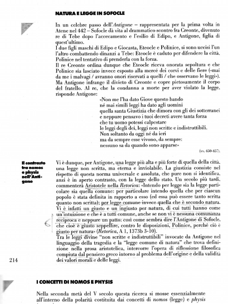 rispett"di questa norma universale e assoluta, che pure non si identificaanri in aperto contrasto, con la legge dello stato. Un sec_olo pi tarfi" commenter Aristotele nella Retorica: "Intendo per legge sia la legge particolare sia q"fii*it"il pi'priicolare inteno qu-lla che pei-ciscu,n popolo stta definita in rapporto a esso (ed essa pu essere tanto scritta qunto non scritta); p-e;..!9gge*g*o-mune-in'veee quella che Q pecondo.-94!l-raVi -a in{--tgti:U4 glugtg e t,4-iugiurto [Link], di cui tutti hanno come un'intririone ih. a tutli coriune, anche se non vi nessuna omunanza " r I'Antigoi di Sofocleneppur .ieciproba e neppure un patto: eos come sembra dire Polini seppellire. che-cio giuo seppeilire. contro le disposizioni, Polinice. perche ci 1373b 3-i0). giugto pertrtntu" (Relorica, A l, I 373b 3- I 0). s1s12" (Renrica. Tra le leggi fivine "non scritte e indistruttibili" invocate da Antigone nel oolegge comune di natura" che trova definilinguaggfo- della tragedia e la ziole lella prosa ristotelica, inlercorre I'opera di riflgssiole filosofica compiuta dafpensiero greco intorno al problema dell'origine e della validita dei valori morali e delle leggi.