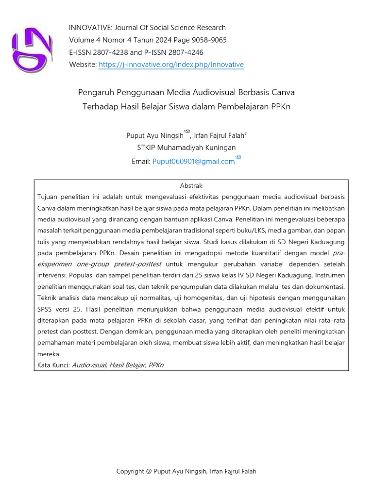 Pengaruh Penggunaan Media Audiovisual Berbasis Canva Terhadap Hasil Belajar Siswa Dalam Pembelajaran PPKN