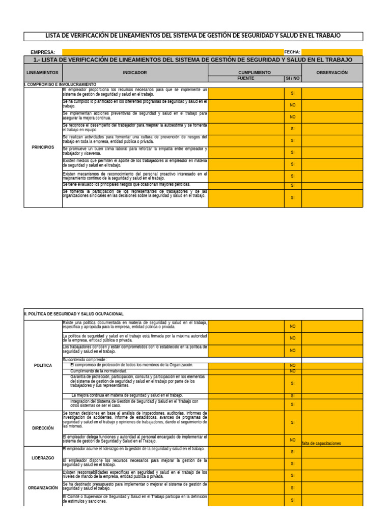 LISTA DE VERIFICACIÓN DE LINEAMIENTOS DEL SISTEMA DE GESTIÓN DE SEGURIDAD Y SALUD EN EL TRABAJO