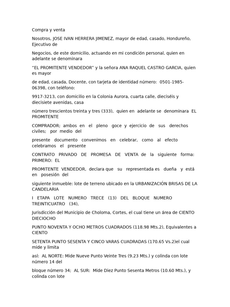 Sula, Cortes.- SEGUNDO: Declaro EL PROMITENTE VENDEDOR; que por