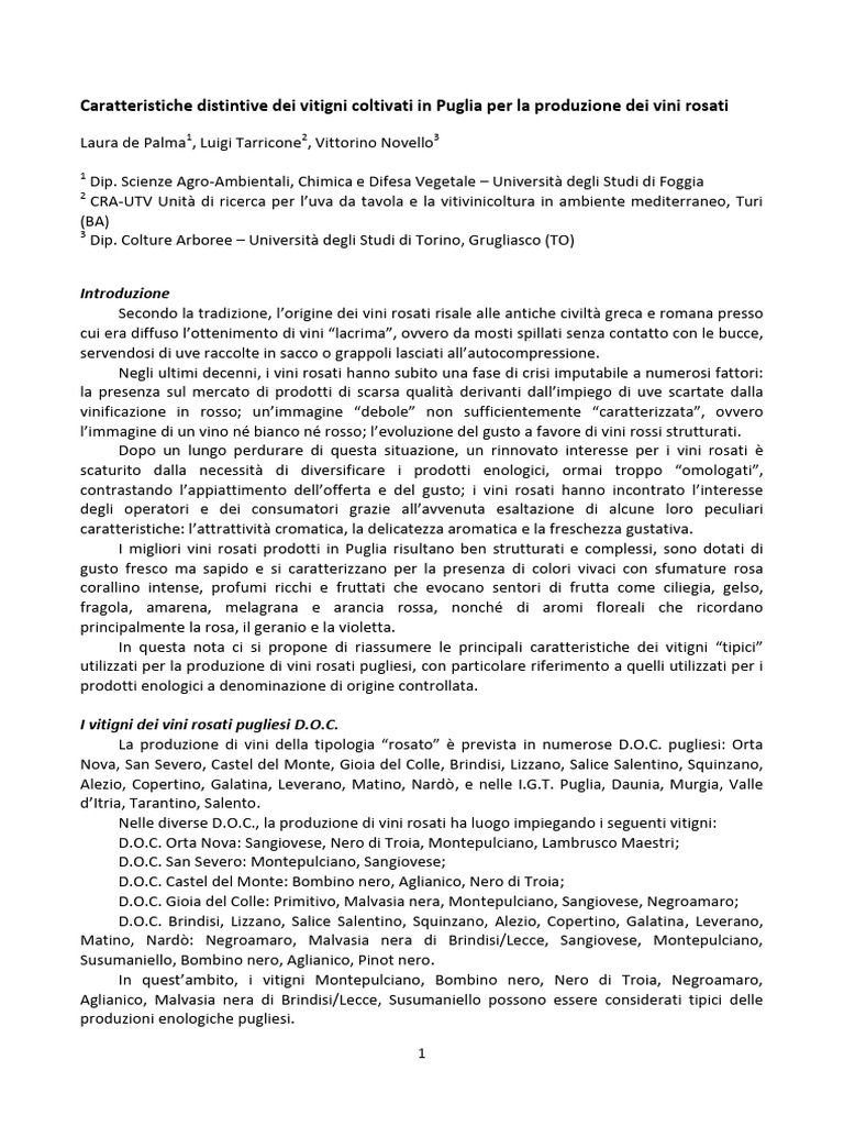 Caratteristiche distintive dei vitigni coltivati in Puglia per la produzione dei vini rosati