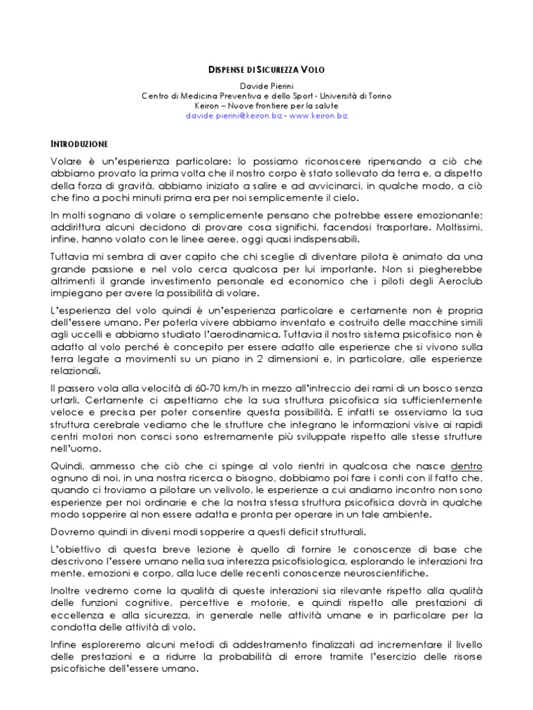 INTRODUZIONE Volare unesperienza particolare: lo possiamo riconoscere ripensando a ci che abbiamo provato la prima volta che il nostro corpo stato sollevato da terra e, a dispetto della forza di gravit, abbiamo iniziato a salire e ad avvicinarci, in qualche modo, a ci che fino a pochi minuti prima era per noi semplicemente il cielo. In molti sognano di volare o semplicemente pensano che potrebbe essere emozionante; addirittura alcuni decidono di provare cosa significhi, facendosi trasportare. Moltissimi, infine, hanno volato con le linee aeree, oggi quasi indispensabili. Tuttavia mi sembra di aver capito che chi sceglie di diventare pilota animato da una grande passione e nel volo cerca qualcosa per lui importante. Non si piegherebbe altrimenti il grande investimento personale ed economico che i piloti degli Aeroclub impiegano per avere la possibilit di volare. Lesperienza del volo quindi unesperienza particolare e certamente non propria dellessere umano. Per poterla vivere abbiamo inventato e costruito delle macchine simili agli uccelli e abbiamo studiato laerodinamica. Tuttavia il nostro sistema psicofisico non adatto al volo perch concepito per essere adatto alle esperienze che si vivono sulla terra legate a movimenti su un piano in 2 dimensioni e, in particolare, alle esperienze relazionali. Il passero vola alla velocit di 60-70 km/h in mezzo allintreccio dei rami di un bosco senza urtarli. Certamente ci aspettiamo che la sua struttura psicofisica sia sufficientemente veloce e precisa per poter consentire questa possibilit. E infatti se osserviamo la sua struttura cerebrale vediamo che le strutture che integrano le informazioni visive ai rapidi centri motori non consci sono estremamente pi sviluppate rispetto alle stesse strutture nelluomo. Quindi, ammesso che ci che ci spinge al volo rientri in qualcosa che nasce dentro ognuno di noi, in una nostra ricerca o bisogno, dobbiamo poi fare i conti con il fatto che, quando ci troviamo a pilotare un velivolo, le esperienze a cui andiamo incontro non sono esperienze per noi ordinarie e che la nostra stessa struttura psicofisica dovr in qualche modo sopperire al non essere adatta e pronta per operare in un tale ambiente. Dovremo quindi in diversi modi sopperire a questi deficit strutturali. Lobiettivo di questa breve lezione quello di fornire le conoscenze di base che descrivono lessere umano nella sua interezza psicofisiologica, esplorando le interazioni tra mente, emozioni e corpo, alla luce delle recenti conoscenze neuroscientifiche. Inoltre vedremo come la qualit di queste interazioni sia rilevante rispetto alla qualit delle funzioni cognitive, percettive e motorie, e quindi rispetto alle prestazioni di eccellenza e alla sicurezza, in generale nelle attivit umane e in particolare per la condotta delle attivit di volo. Infine esploreremo alcuni metodi di addestramento finalizzati ad incrementare il livello delle prestazioni e a ridurre la probabilit di errore tramite lesercizio delle risorse psicofisiche dellessere umano.